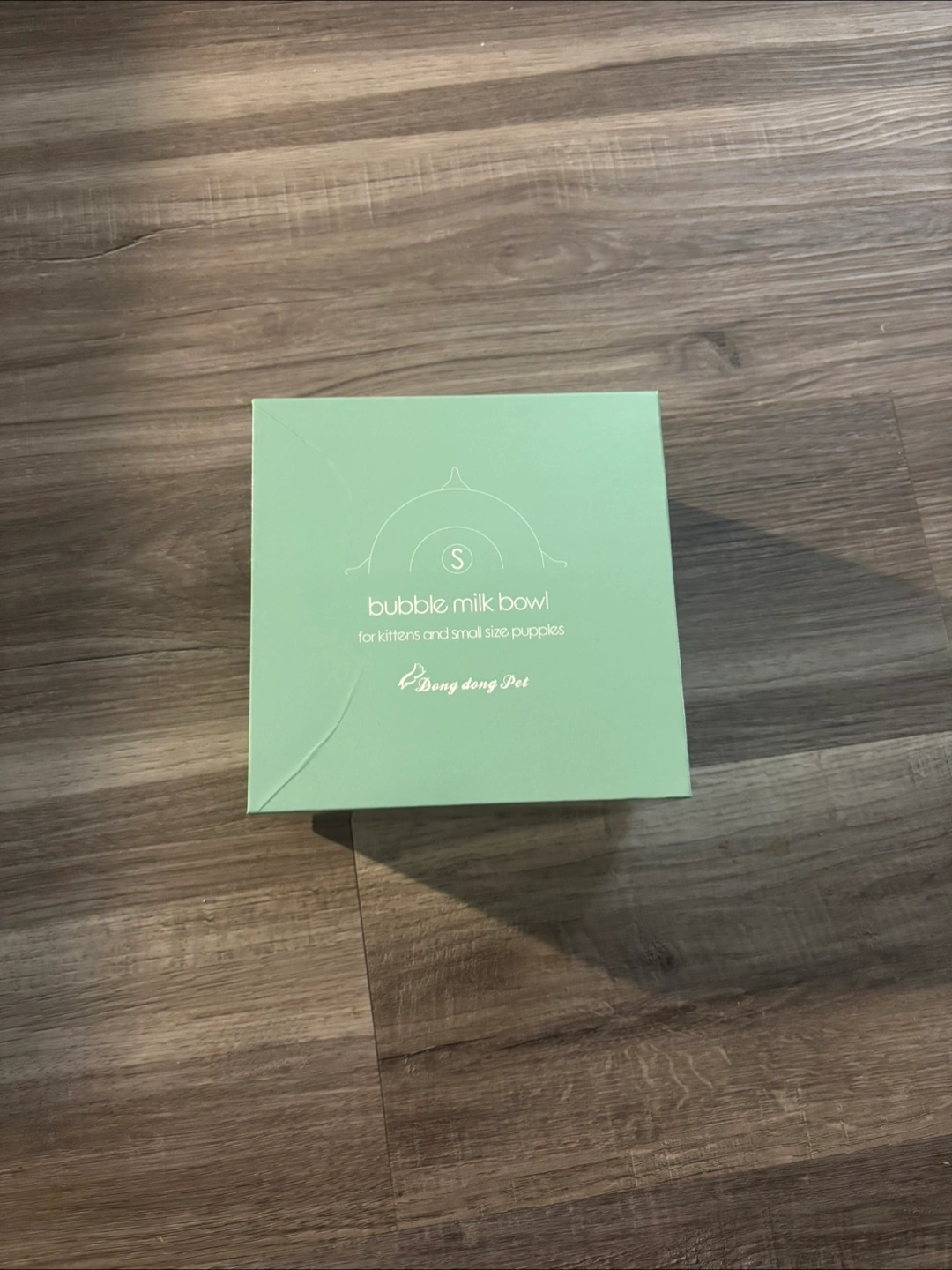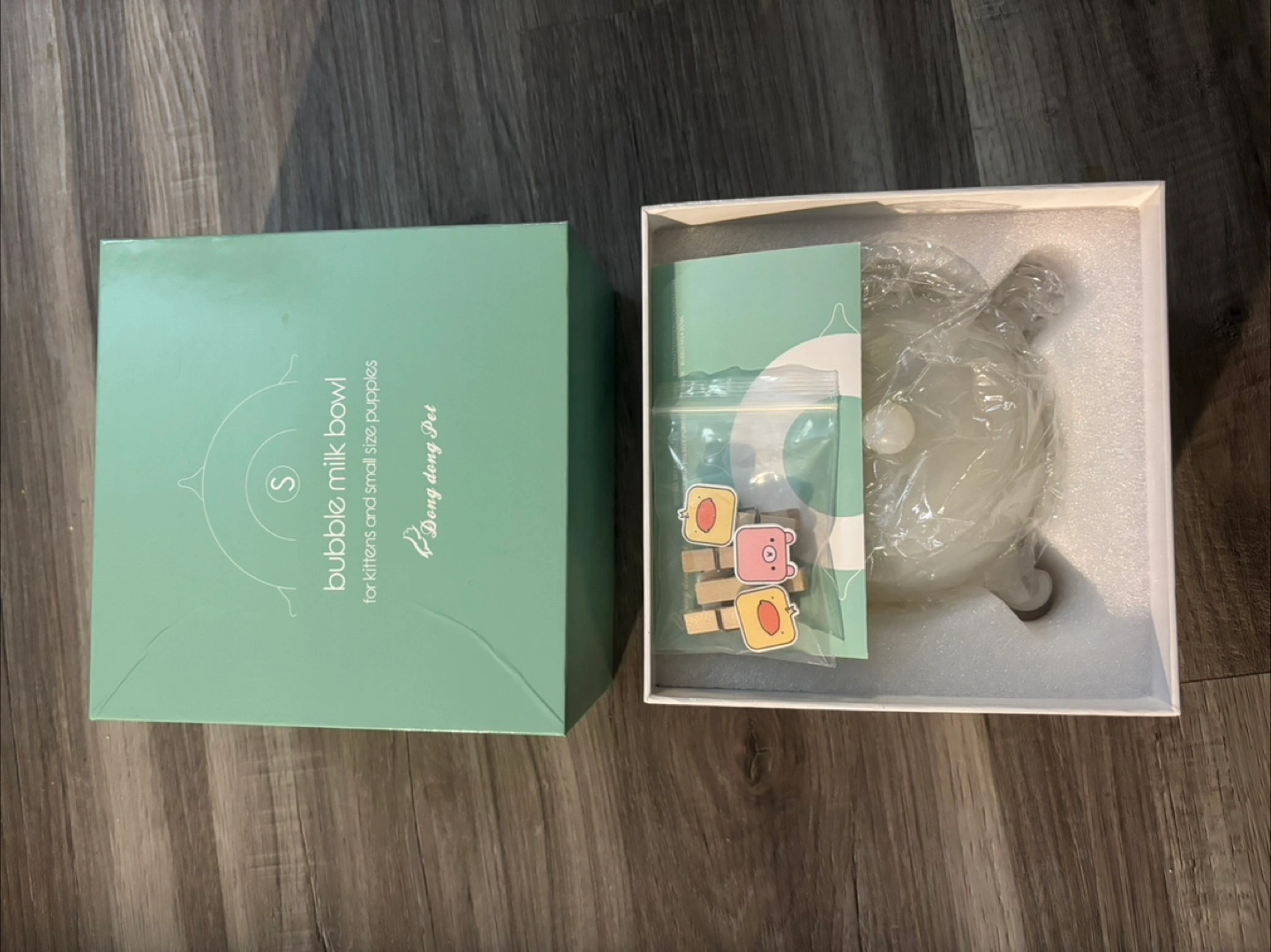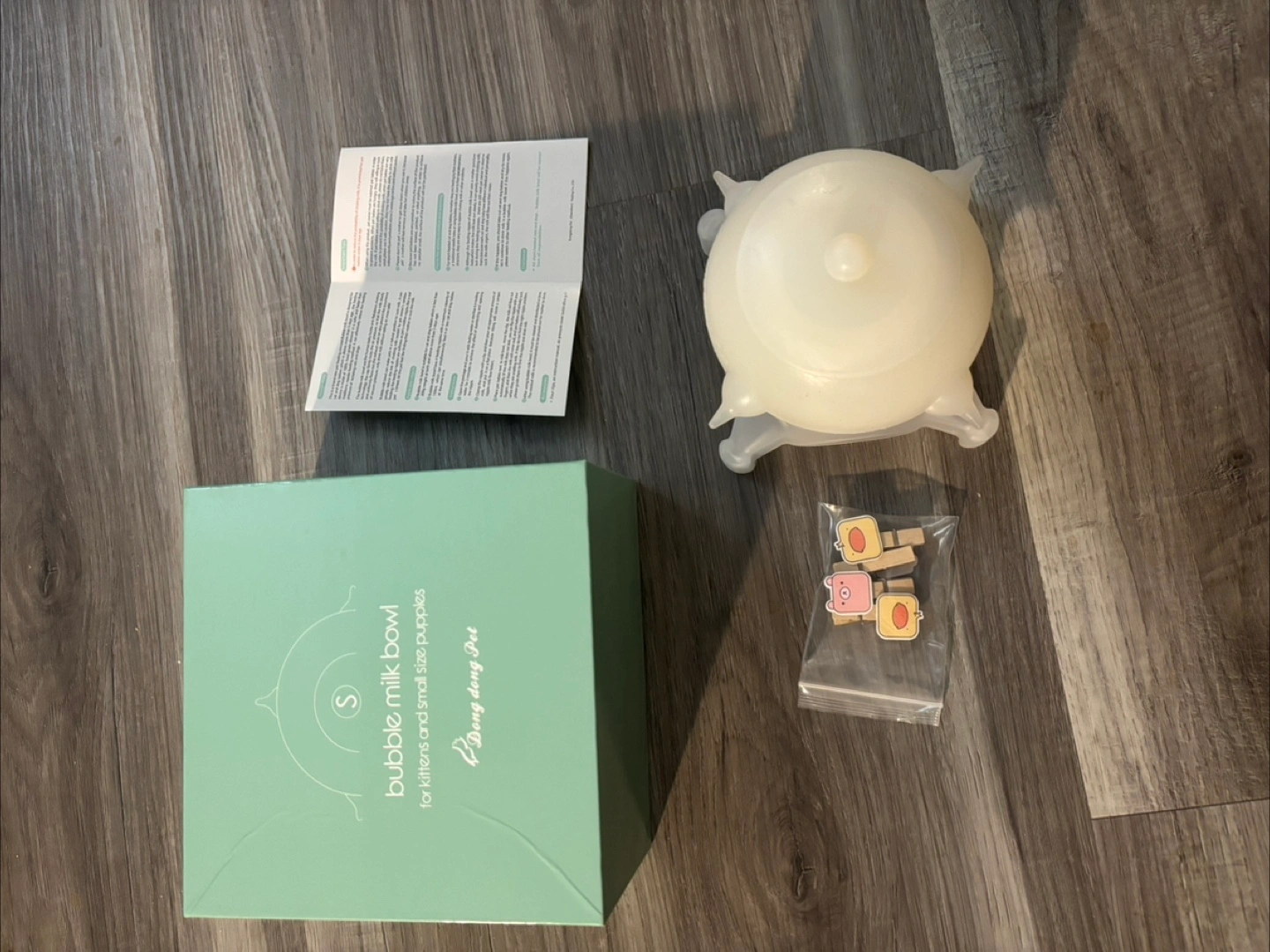 Mint green box. Contains a bubble milk bowl, tiny wooden clips, and a small instruction sheet. Comes with all the necessary components. Your pets will love this bowl for drinking milk from.