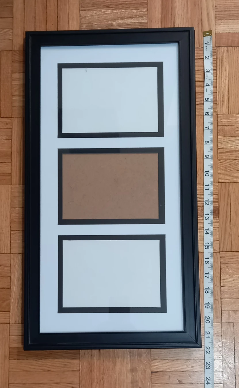 I have this double matted picture frame for three 5"x7" photos/prints. Can be hung vertically or horizontally. In like-new condition, black, no scratches or marks on frame nor glass.