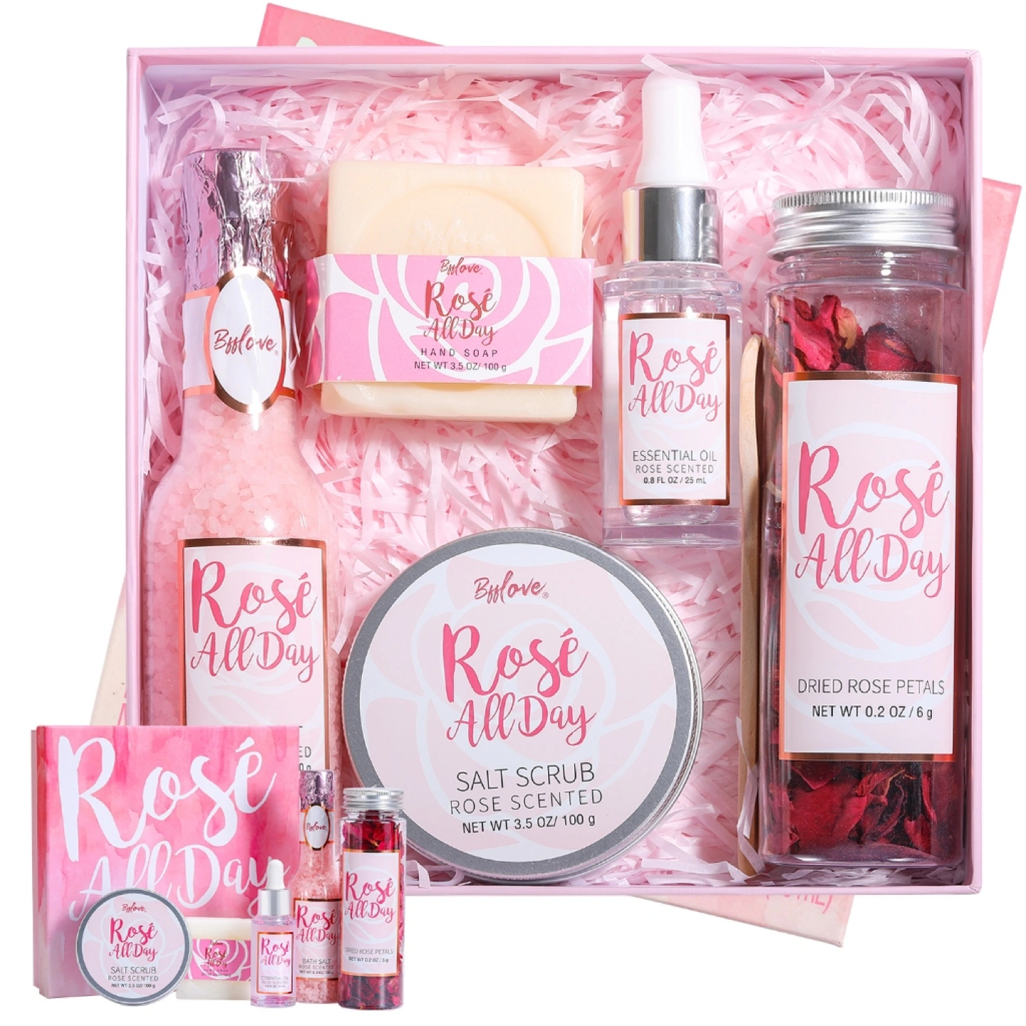 A lovely gift set filled with rose-scented products. Contains various items such as a hand soap, essential oil, bath salt and dried rose petals. This set is perfect for creating a spa-like experience at home.