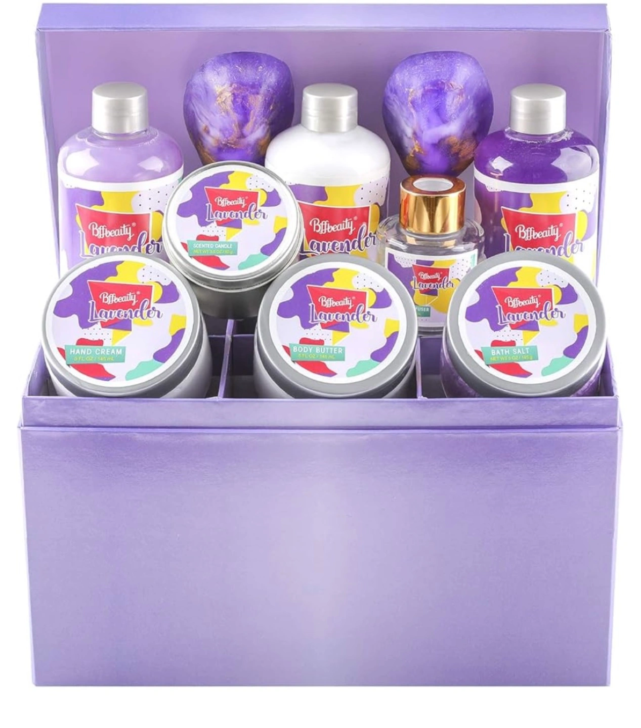 A lovely gift set. Includes different lavender scented items. Perfect for a relaxing spa night.