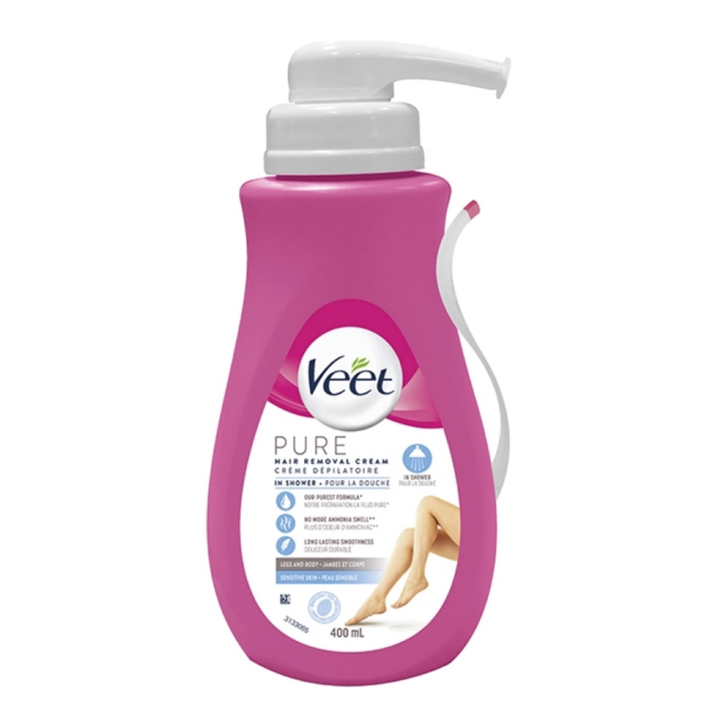 A pink bottle with a white pump. The bottle contains hair removal cream. Perfect for use in the shower, it will leave you feeling refreshed and confident after each use.