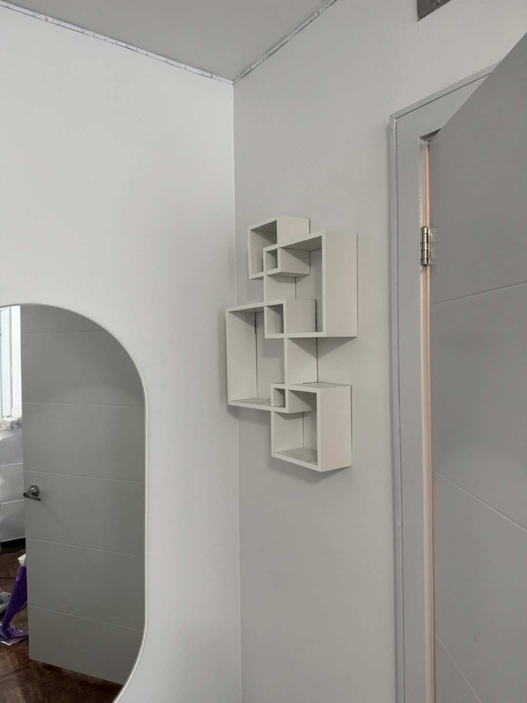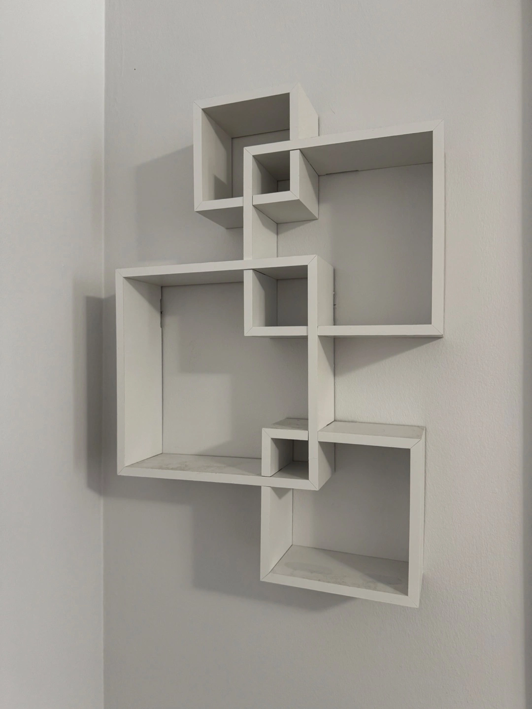 White wall shelf. Features multiple cubbies of varying sizes. The design appears to be a set of squares interlocked. A great place to display your favourite decorative items, for a calming atmosphere at home.