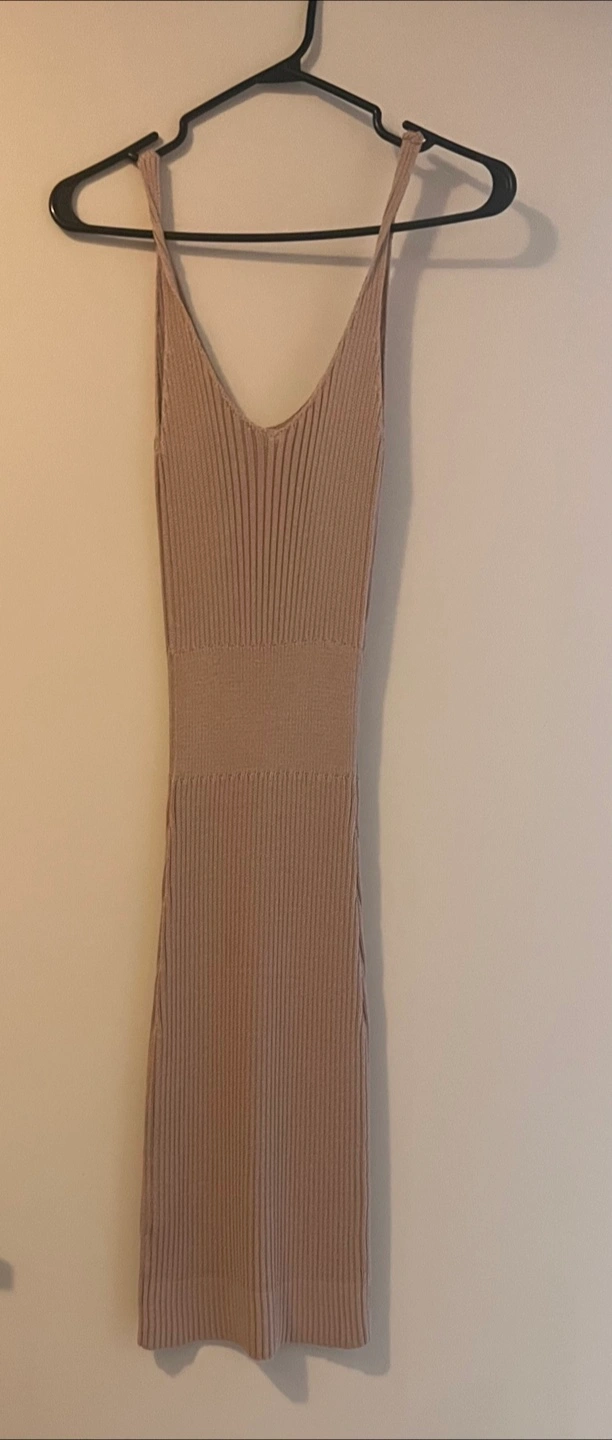 A comfortable dress with thin straps. It is knit and looks like it would be great for layering. A simple dress to wear on a warm summer day will truly feel amazing.