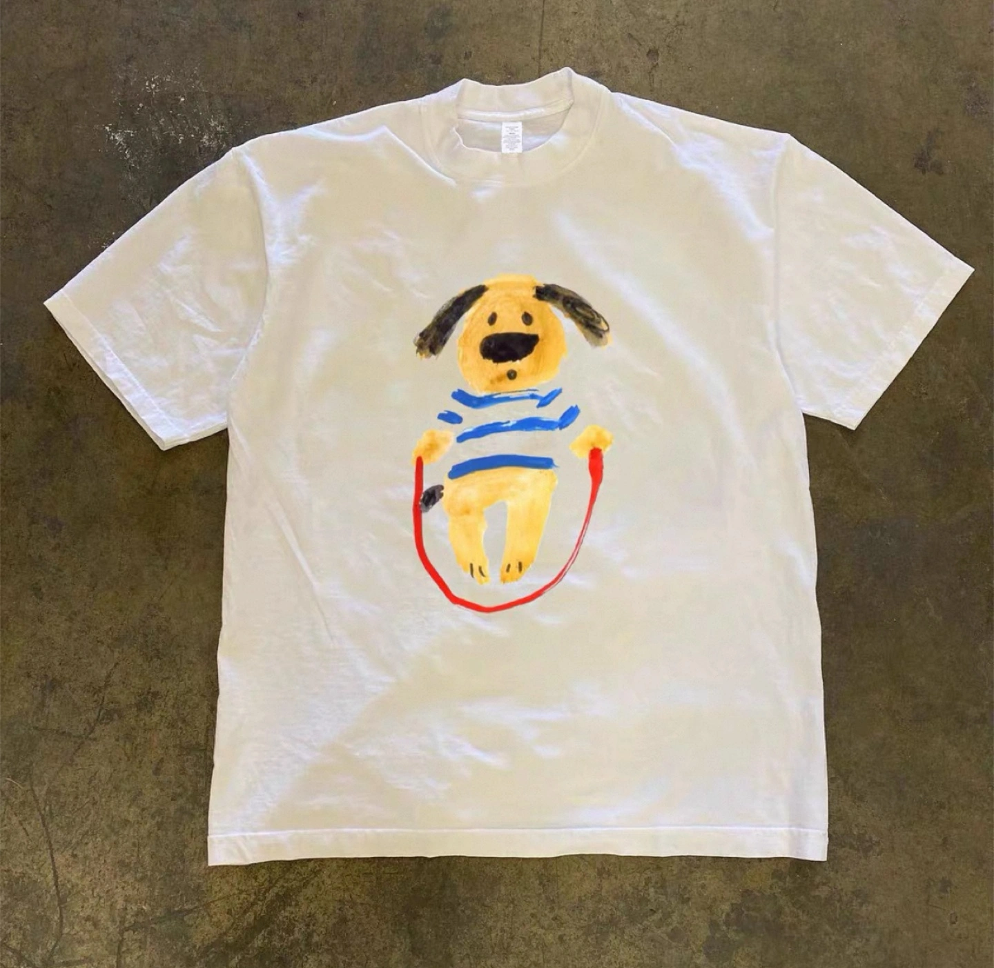 A short-sleeved tee featuring a dog graphic. Graphic appears to be hand-painted, likely with watercolor. The shirt has a classic crew neck. Perfect for a comfy day at home.