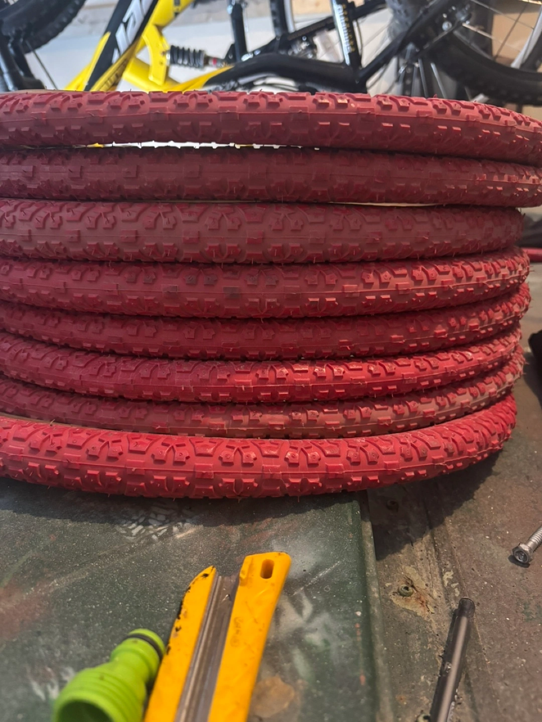 A collection of red bicycle tires. The tires are stacked on top of each other. The sidewalls have a contrasting colour. These tires will offer a smooth ride for your next cycling adventure.
