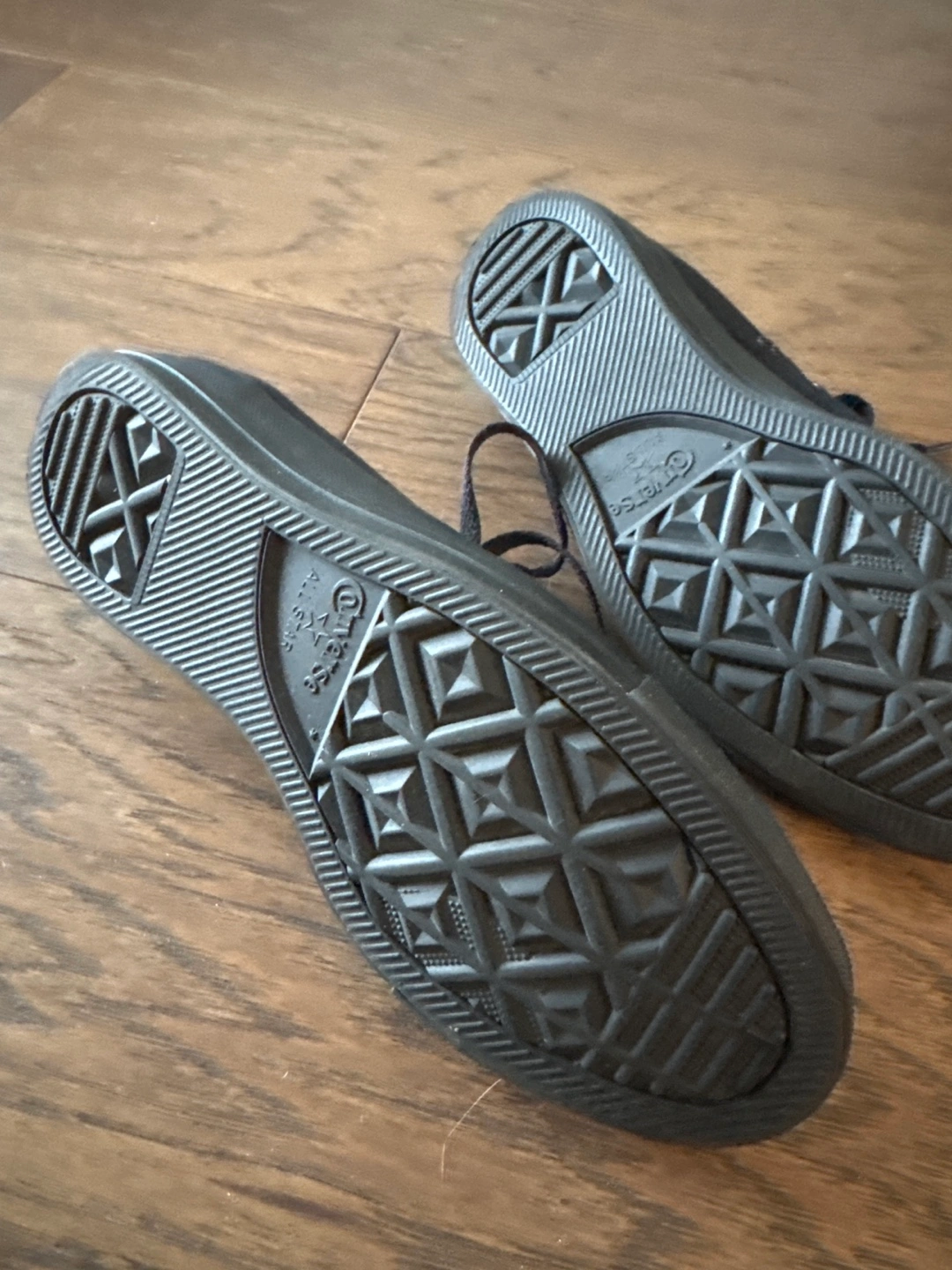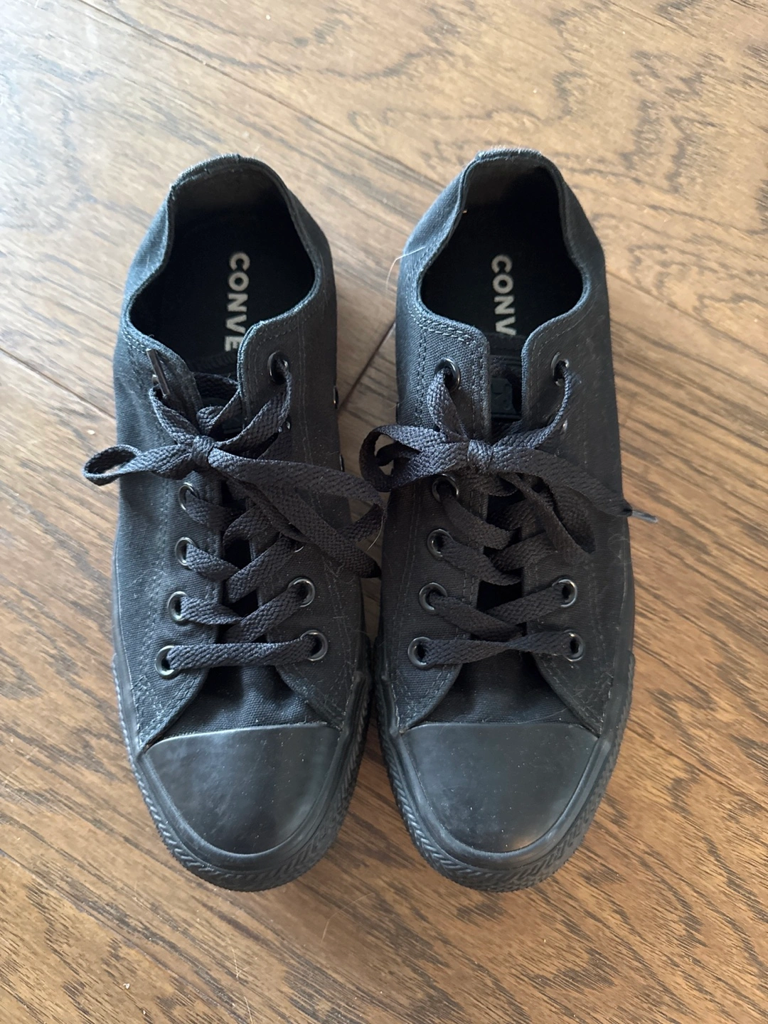 161A pair of black Converse All-Star sneakers. They are lace-up style with rubber soles. Great for everyday wear, whether running errands or hanging out with friends.