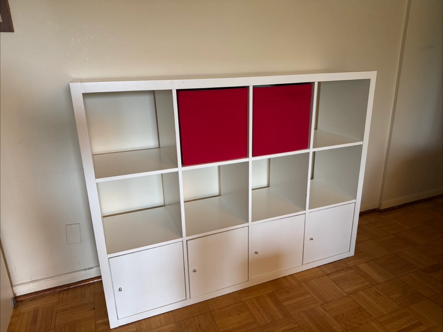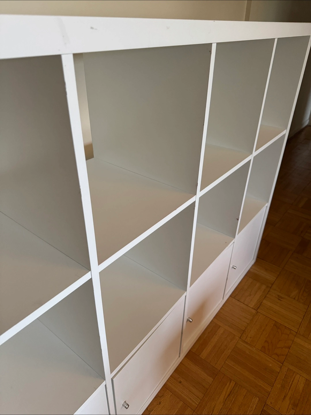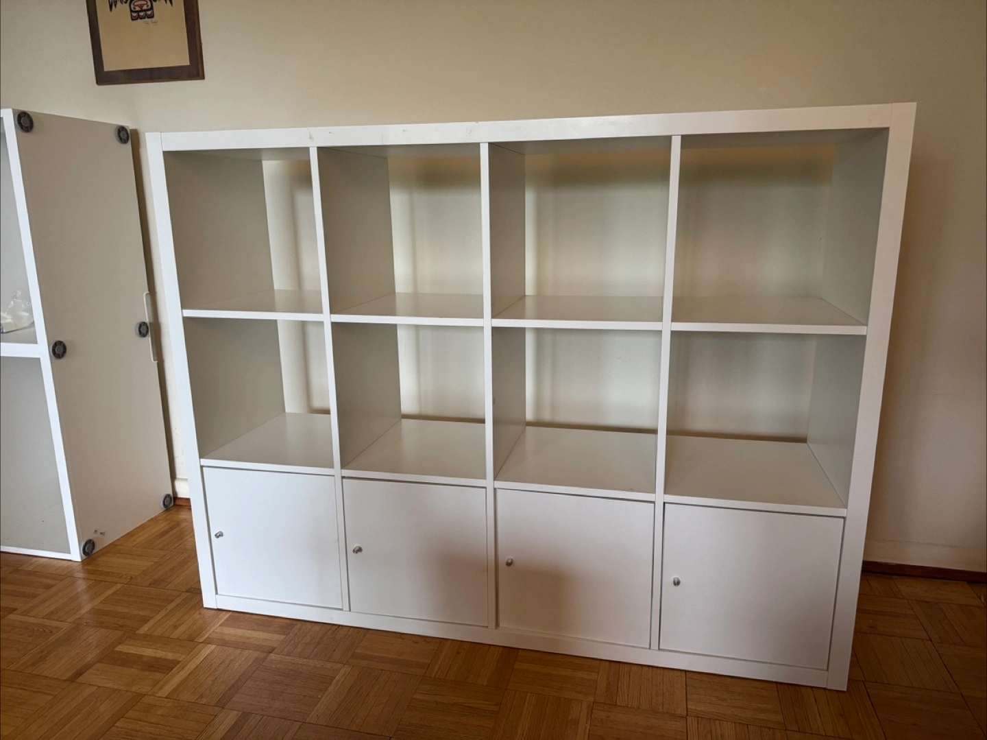 White shelf storage unit with several shelves. Features four doors at the bottom. Cube organizers can be a great place to organize and house anything from books to decor.