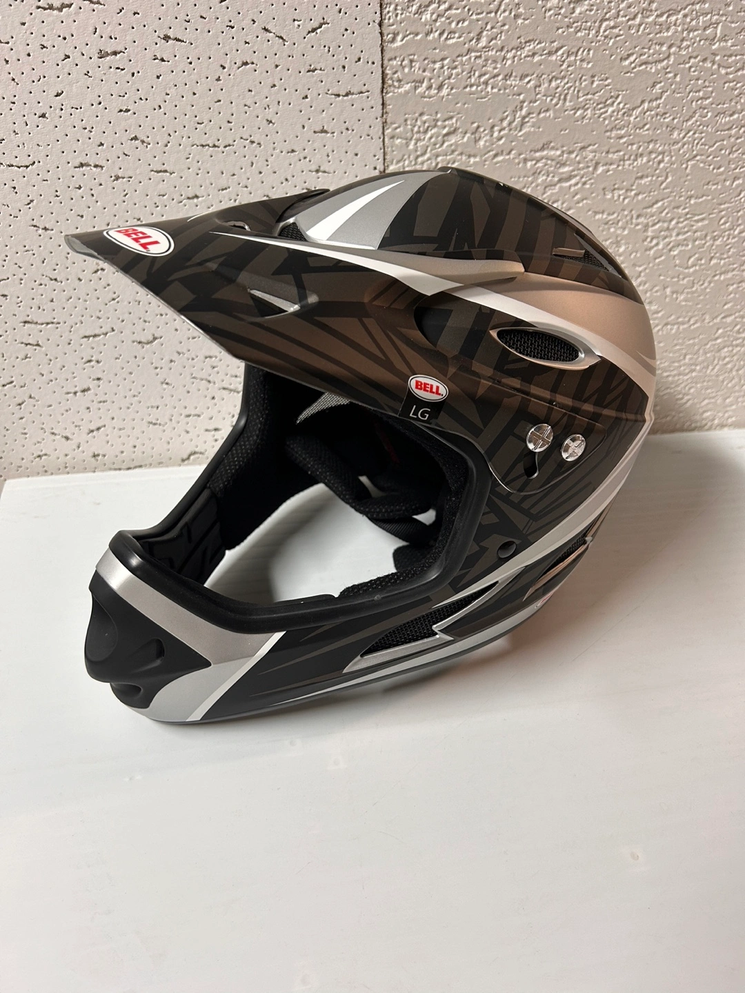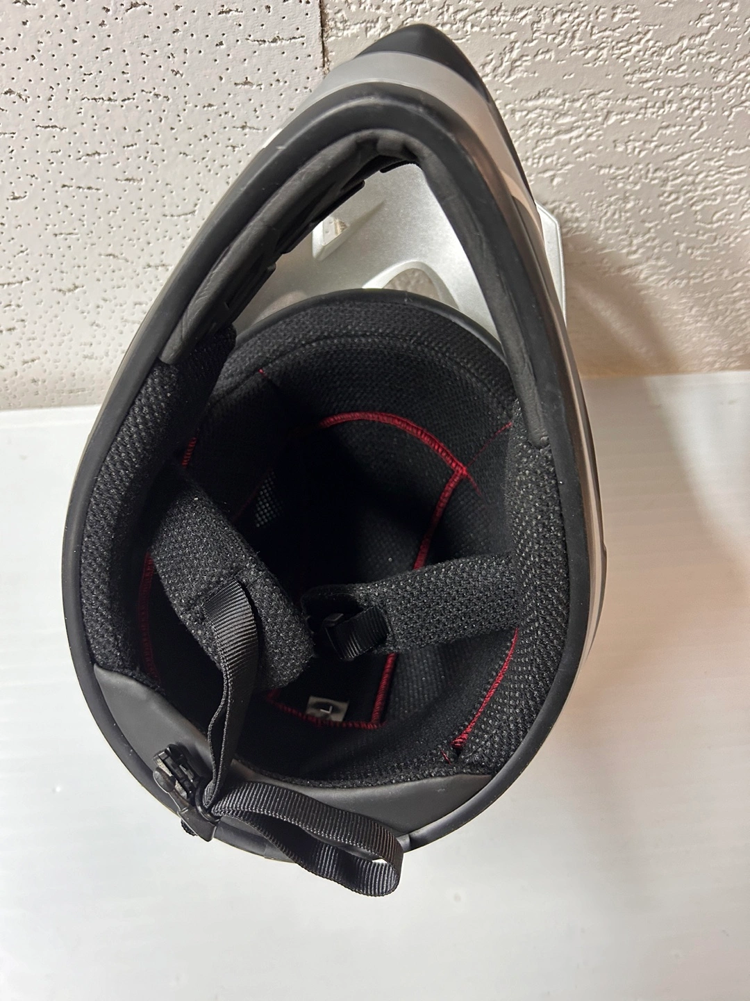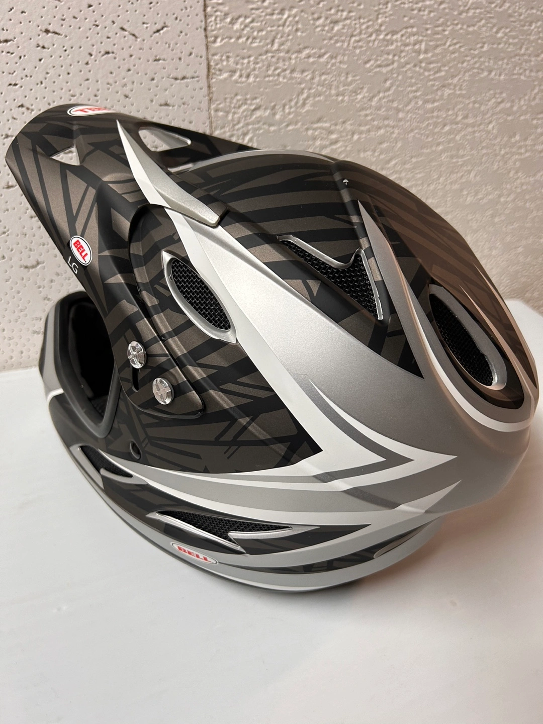 Helmet, with a black and silver pattern. Features ventilation holes. Includes a strap with a buckle. A good item to have when riding a bike or other sporting activities.