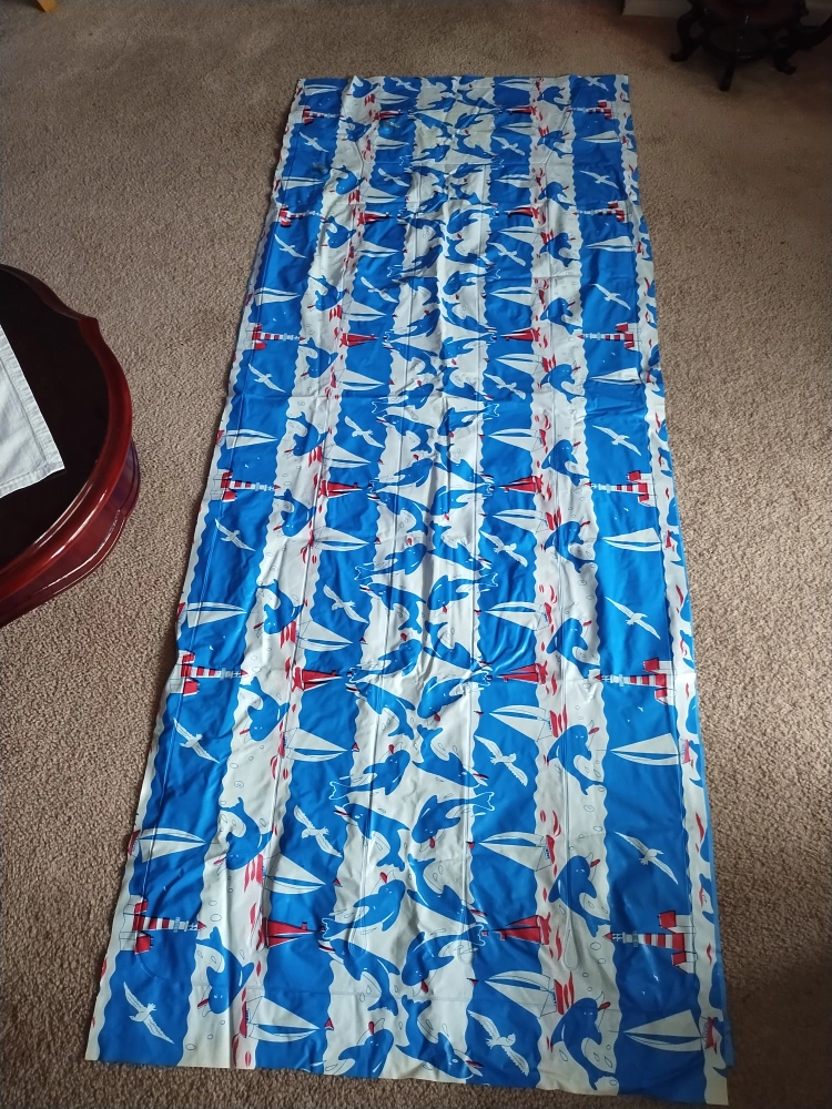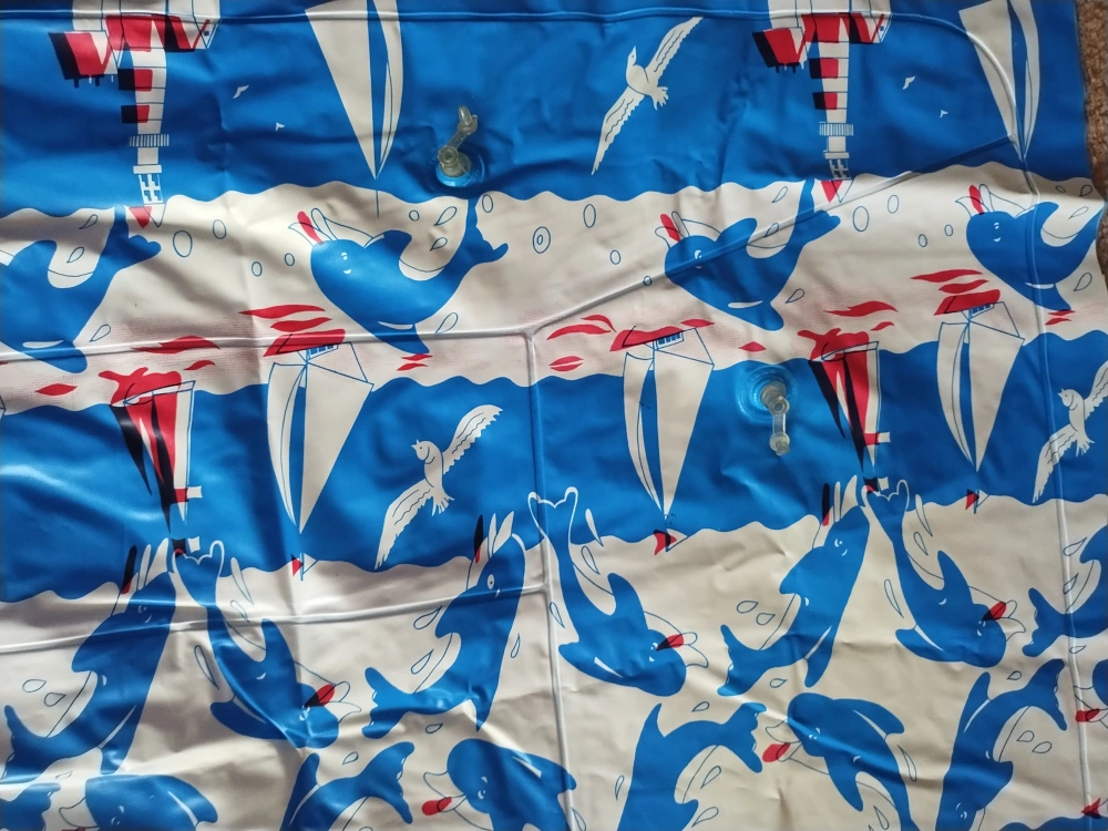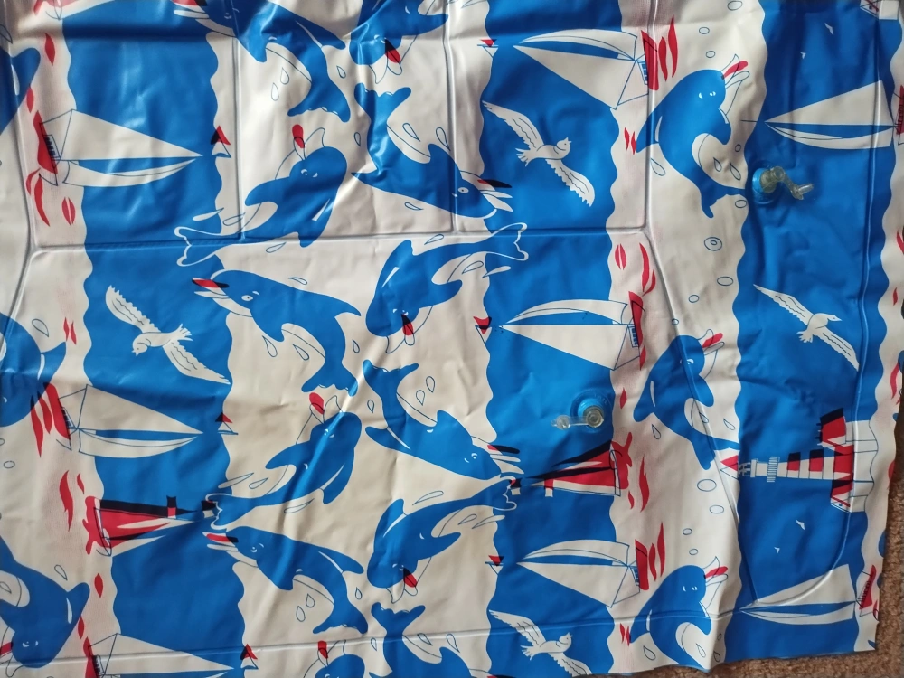 I am selling an inflatable pool lounger. Blue and white design with dolphins, seagulls, and boats. Great to relax on the water on a hot summer day. Never used