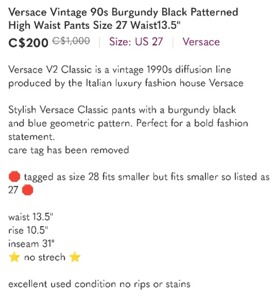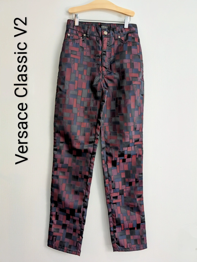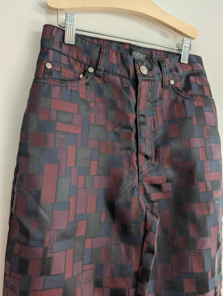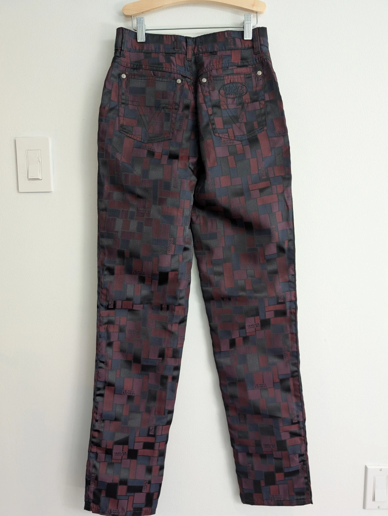 694Gorgeous patterned Designer Vintage pants. These high-waisted pants have a square pattern. Dark burgundy black and blue colours can be seen throughout the fabric. waist 13.5" tagged 28 but fit smaller see measurements in photos excellent used condition