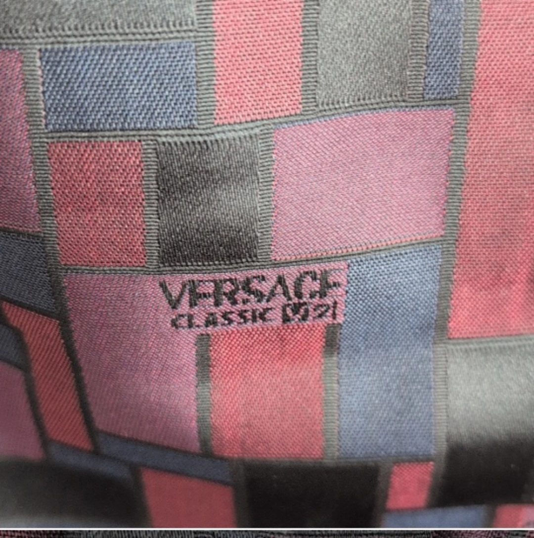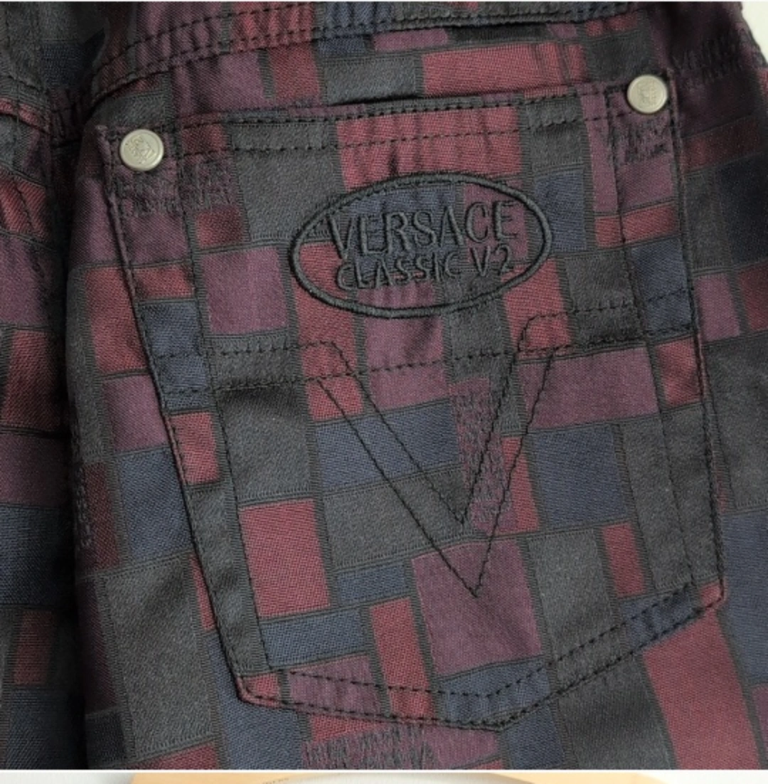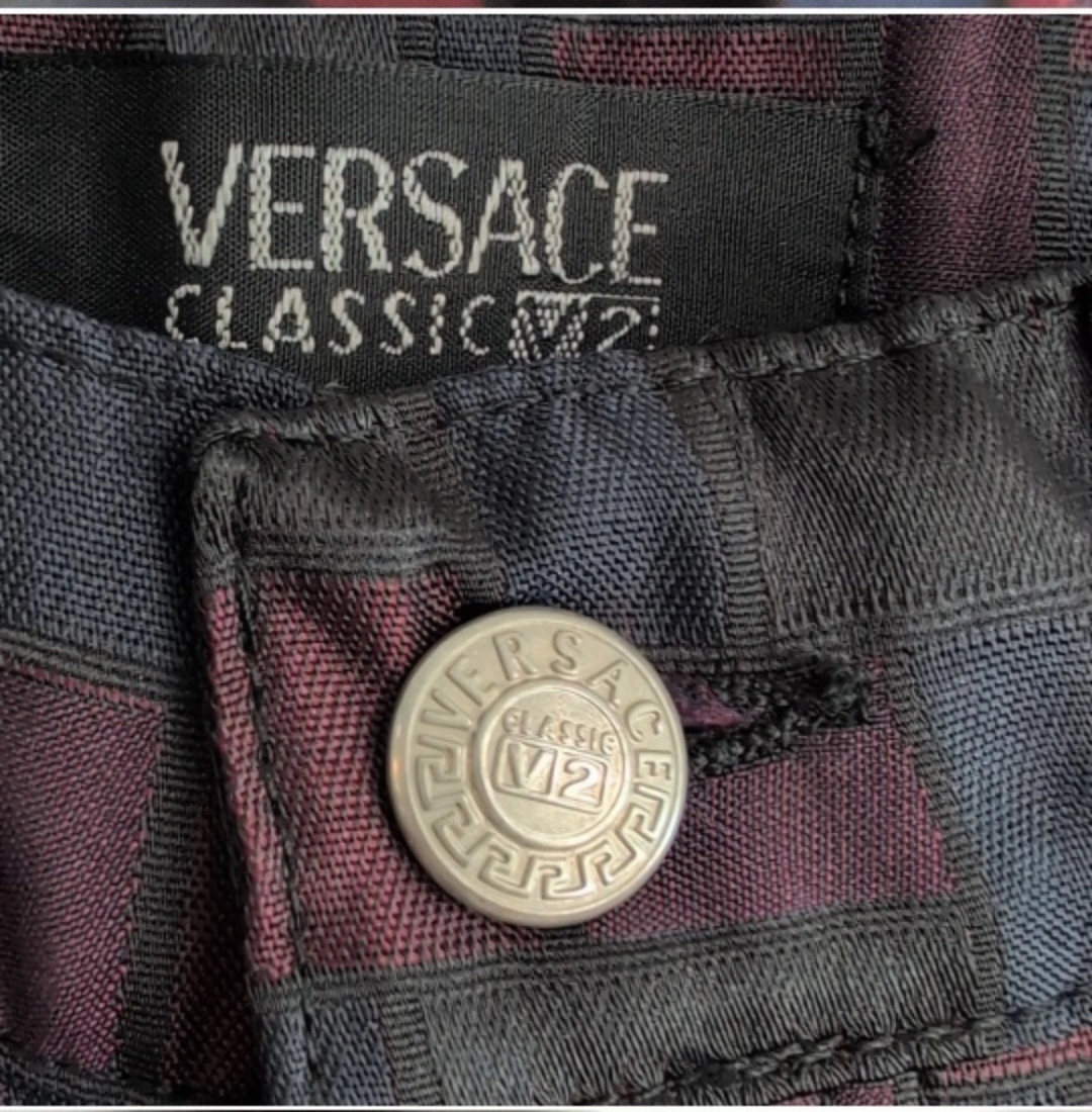 694Gorgeous patterned Designer Vintage pants. These high-waisted pants have a square pattern. Dark burgundy black and blue colours can be seen throughout the fabric. waist 13.5" tagged 28 but fit smaller see measurements in photos excellent used condition