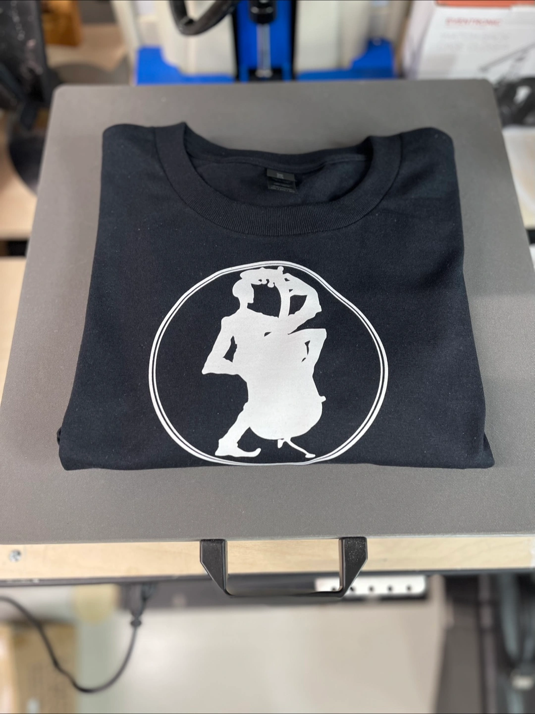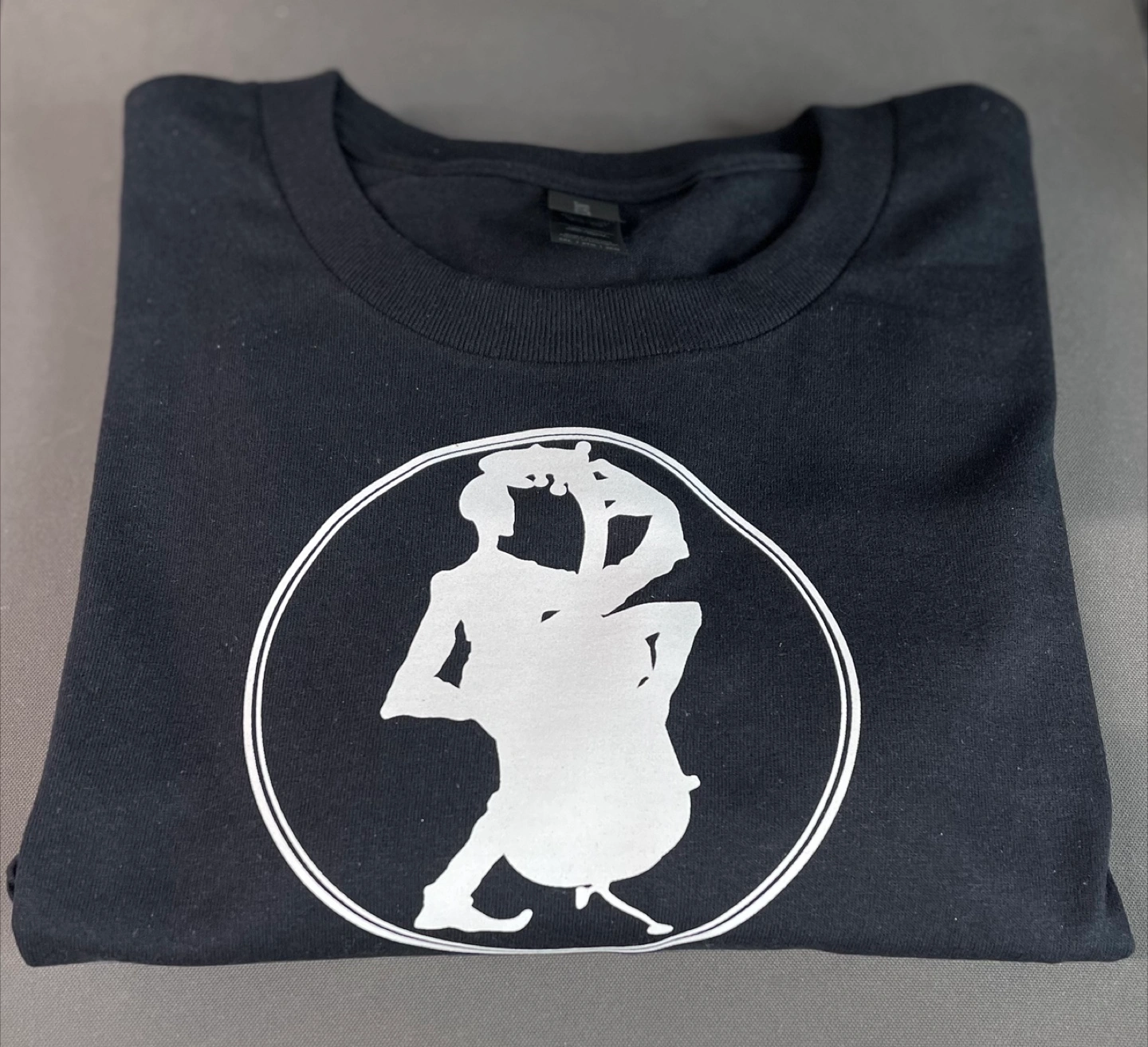 Black t-shirt. Crew neck. Features a printed graphic. Perfect for casual wear, providing comfort and style.