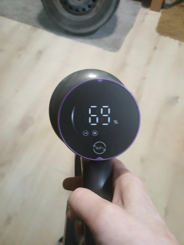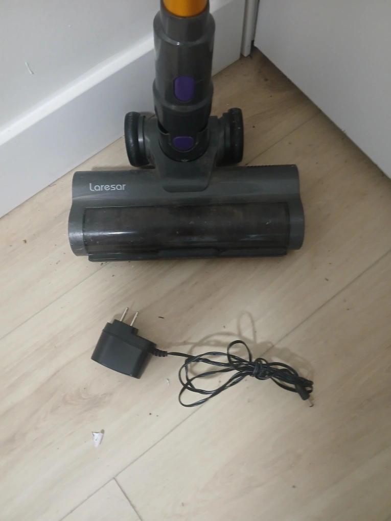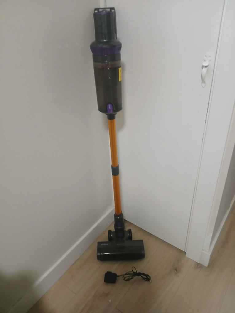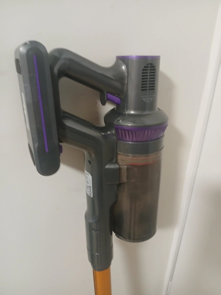 An upright vacuum cleaner, with an orange and grey colour scheme. Included is a charging adaptor, and various attachments. It also has a digital display. A great way to keep your home clean and stress-free.