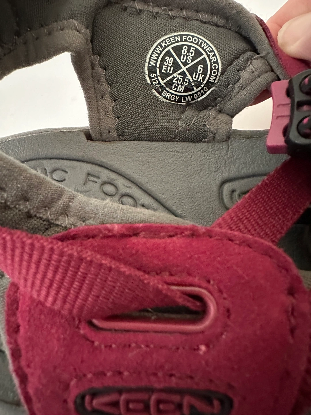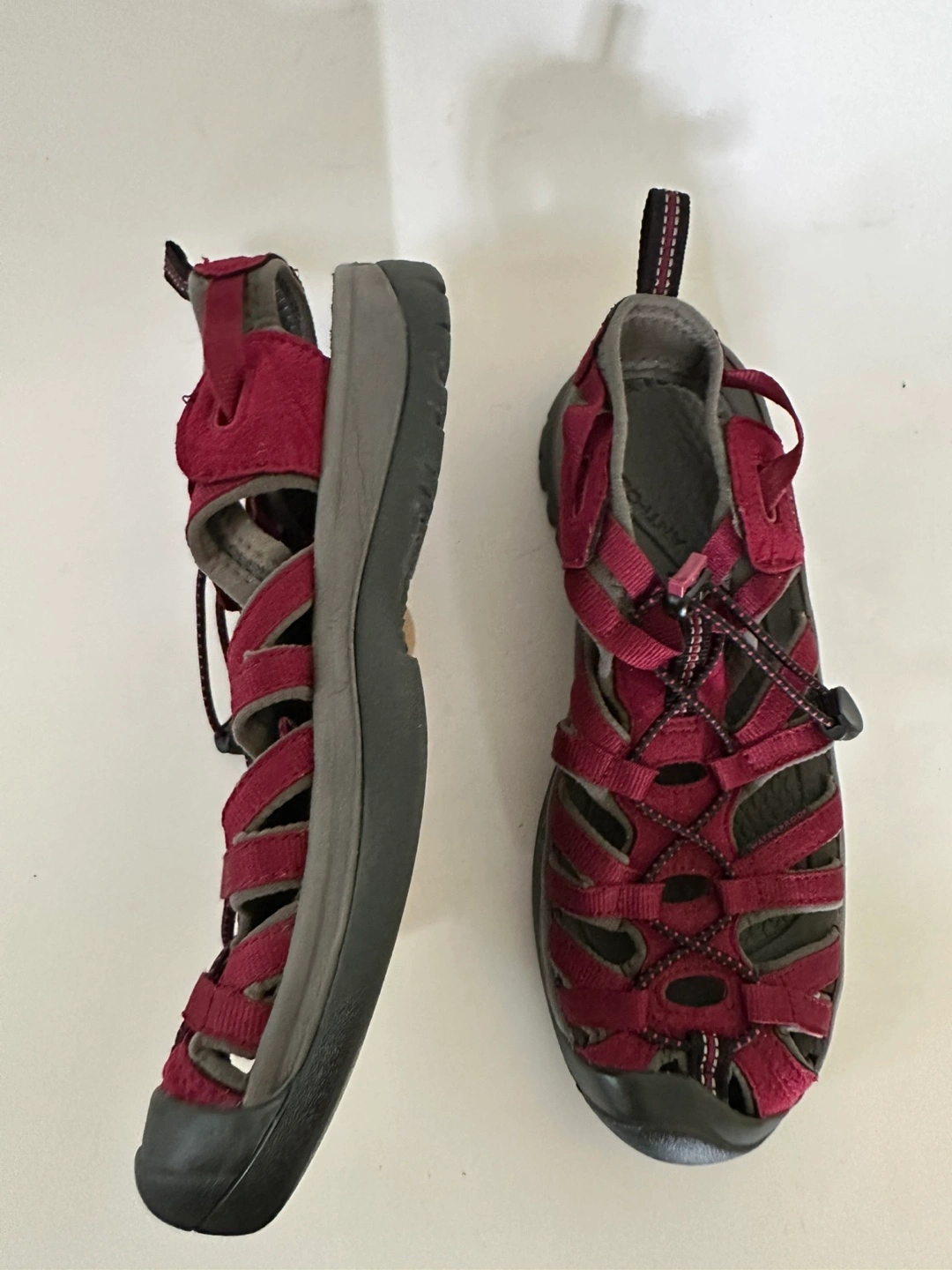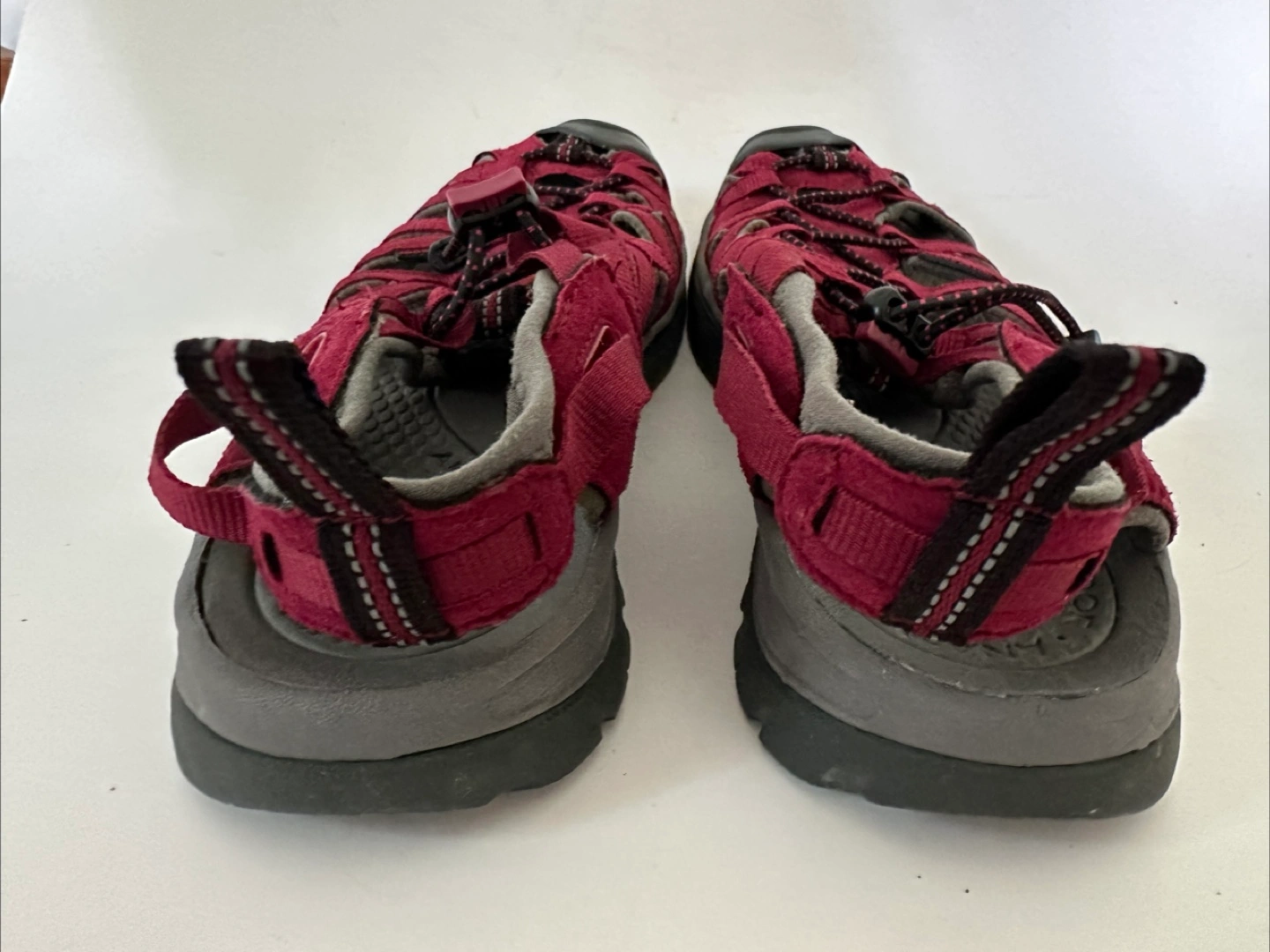 65In excellent pre-loved condition. Burgundy and grey sandals. Strappy design. Sport lace closure. Washable. Perfect for your next hike. These shoes have been meticulously cleaned and sanitized. Size 8.5 From a smoke free, pet free home. Pick up in Alta Vista.