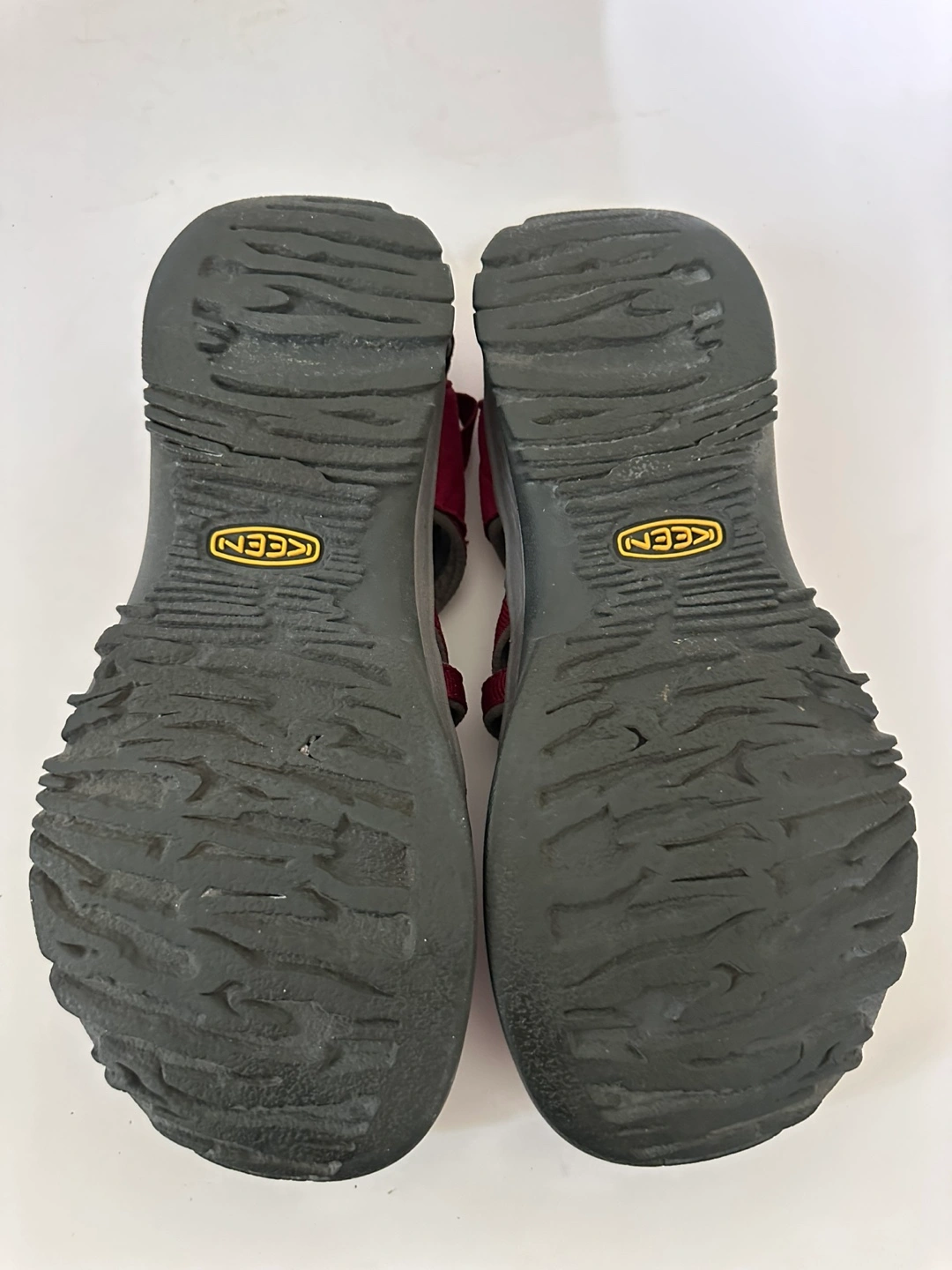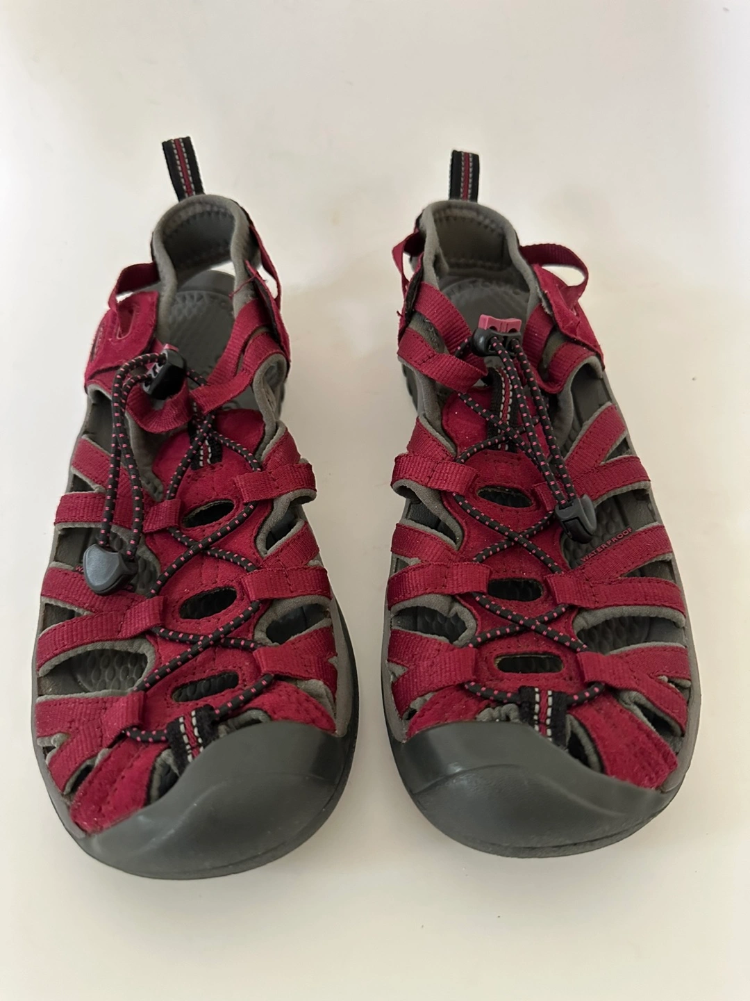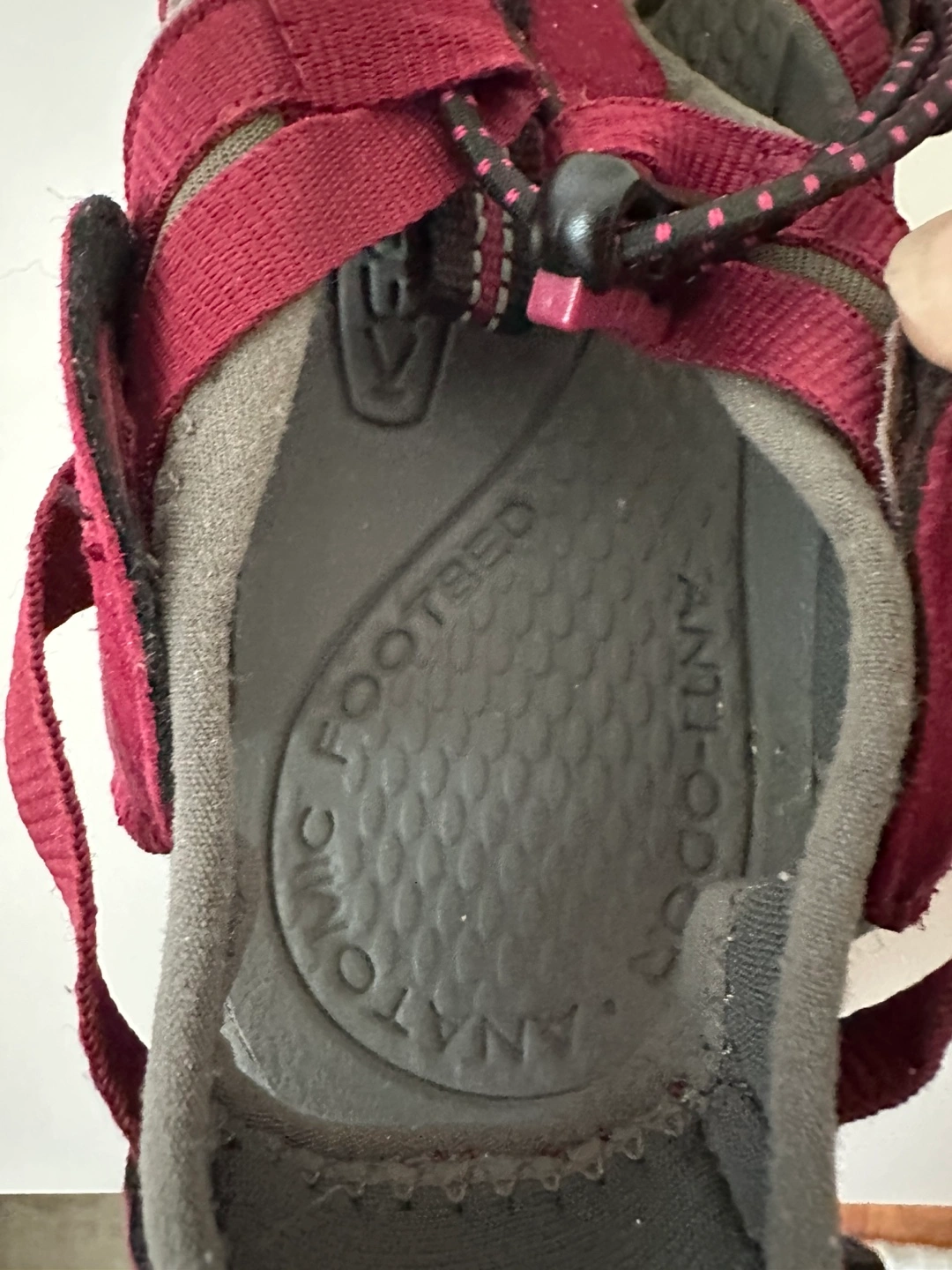 65In excellent pre-loved condition. Burgundy and grey sandals. Strappy design. Sport lace closure. Washable. Perfect for your next hike. These shoes have been meticulously cleaned and sanitized. Size 8.5 From a smoke free, pet free home. Pick up in Alta Vista.