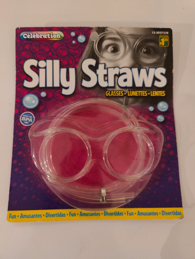Clear plastic silly straws, shaped like glasses in original unopened packaging. Please do not text with just Hi and a wave. Only text if you want the product, and say when you want to pick up from Bayview-Cummer area, otherwise I will not respond.