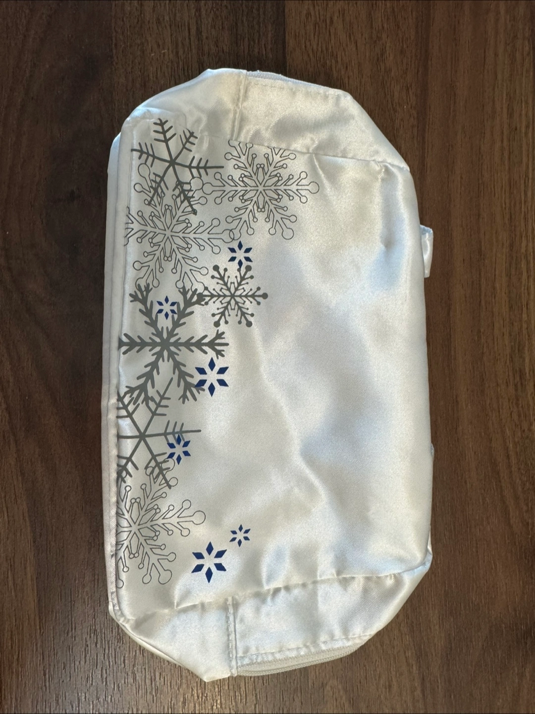 A small, white cosmetic bag. Features snowflakes in a silver colour. A zipper closure. This would be a wonderful place to store your makeup essentials.