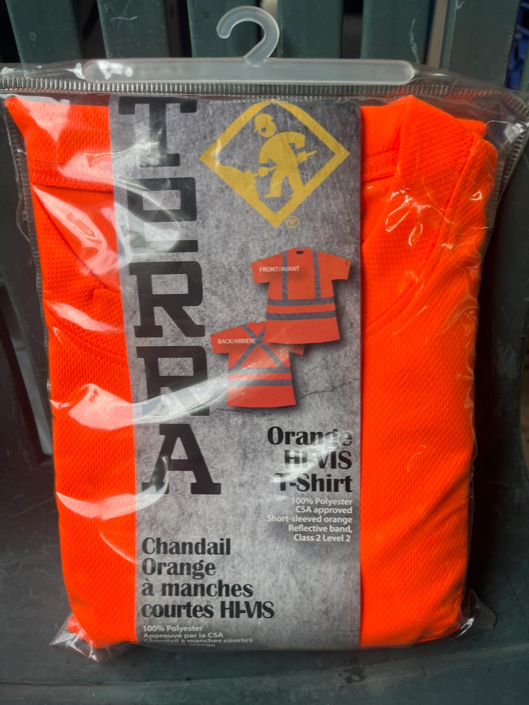 58A new, packaged orange short-sleeved t-shirt. Features reflective bands. Could be a good choice to stay visible during outdoor activities.