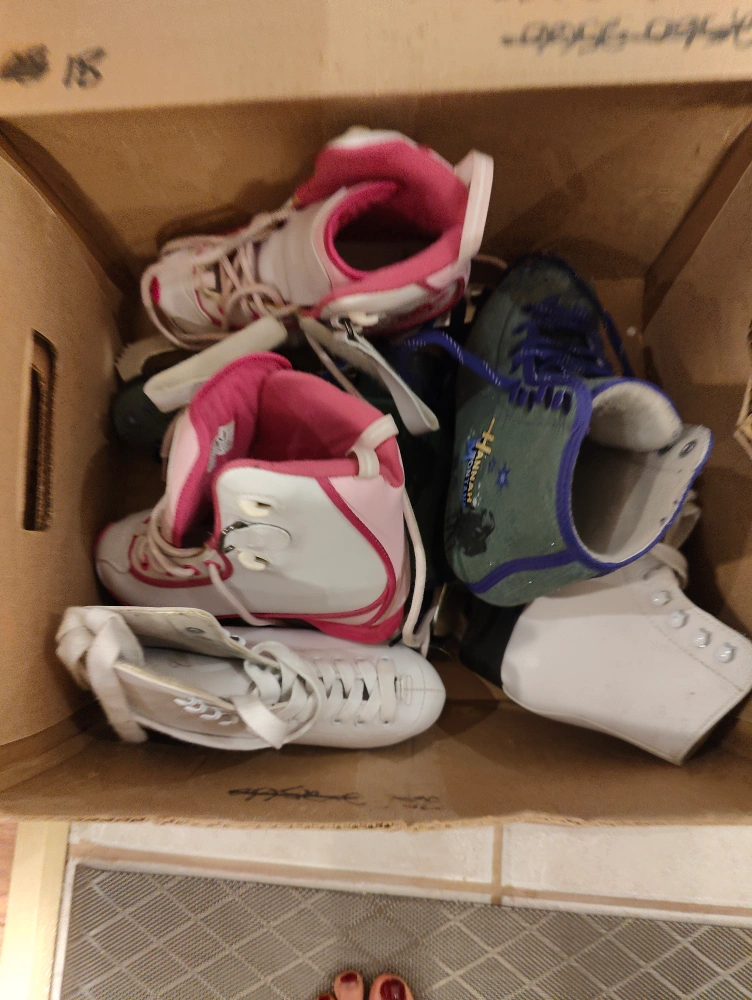 Assortment of girls kids skates x 3 pairs. Seems like Size 13 J, Size 1 and size 4. Please take all. They have been well used over 15 years ago.