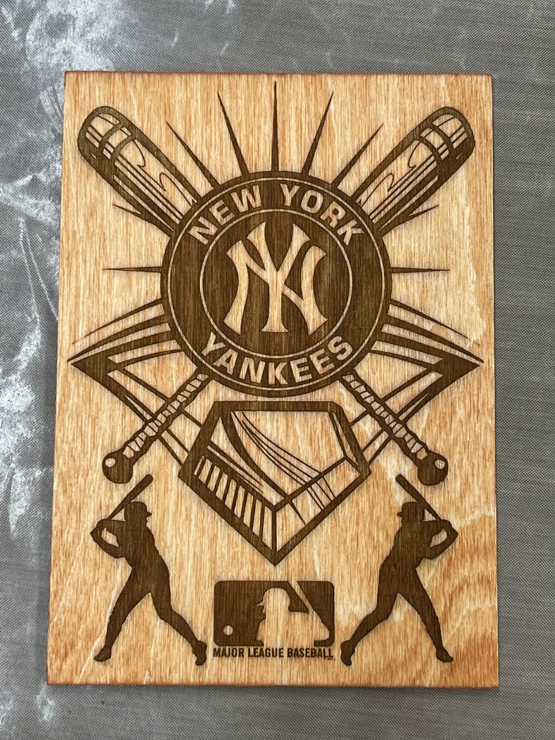 Wooden wall art featuring the New York Yankees logo and baseball imagery.