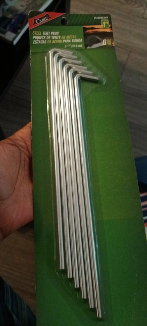 It is unopened brand new! I bought this yesterday, I don't want this now.Set of steel tent pegs. Pegs are in a sealed package. Having these pegs, you can confidently set up your tent and relax.
