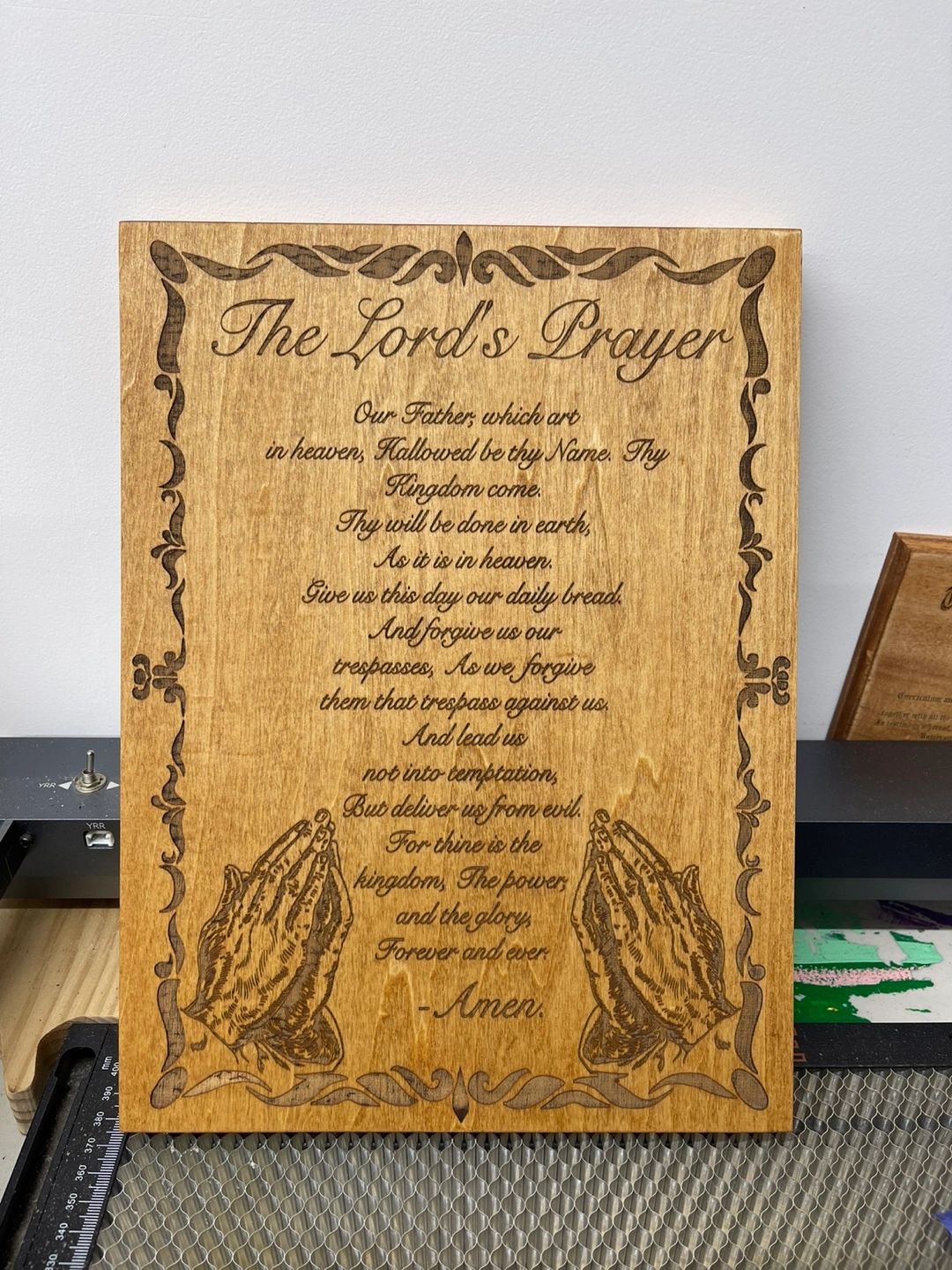 The Lord's Prayer is engraved on a wooden plaque. It features detailed design around the edges. Praying the words inscribed on this plaque will bring a sense of peace to your heart. 5” x 7” inches.
