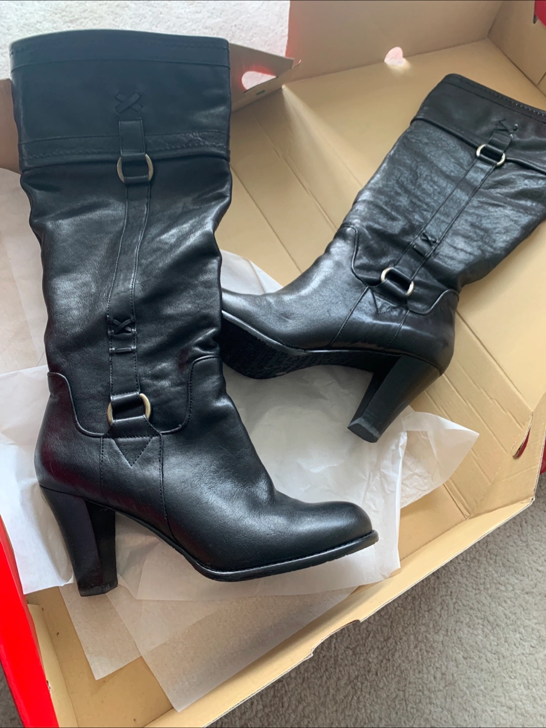 Black leather knee-high boots. Block heel and side zipper closure with buckle accents. Excellent condition. Only worn twice.