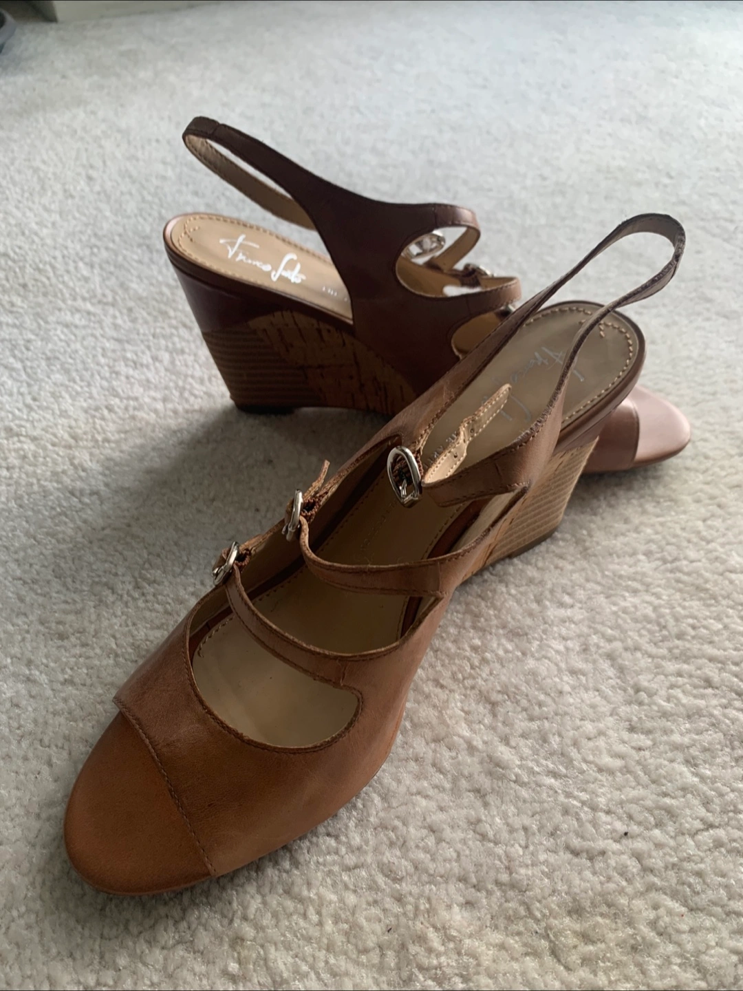 These tan leather wedges feature a cork heel. Open toe ankle strap. Brand new! Imagine wearing these on a warm summer day.