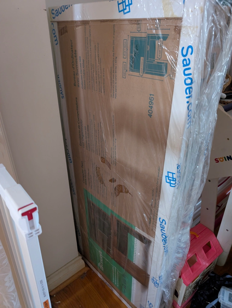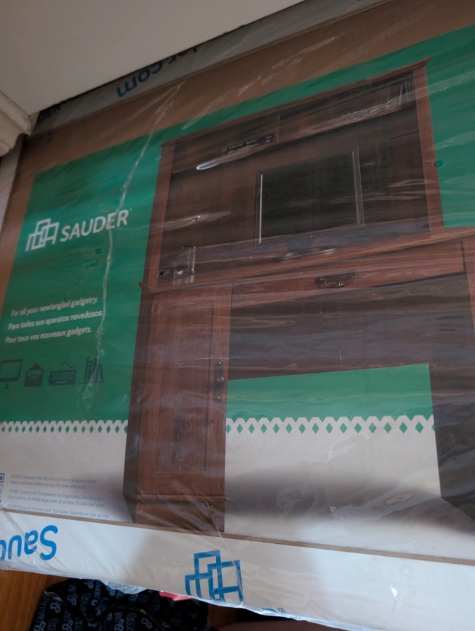 The box is sealed, showing the desk in its original packaging. Featuring a computer desk with a hutch. It would be a great addition to any home office.
