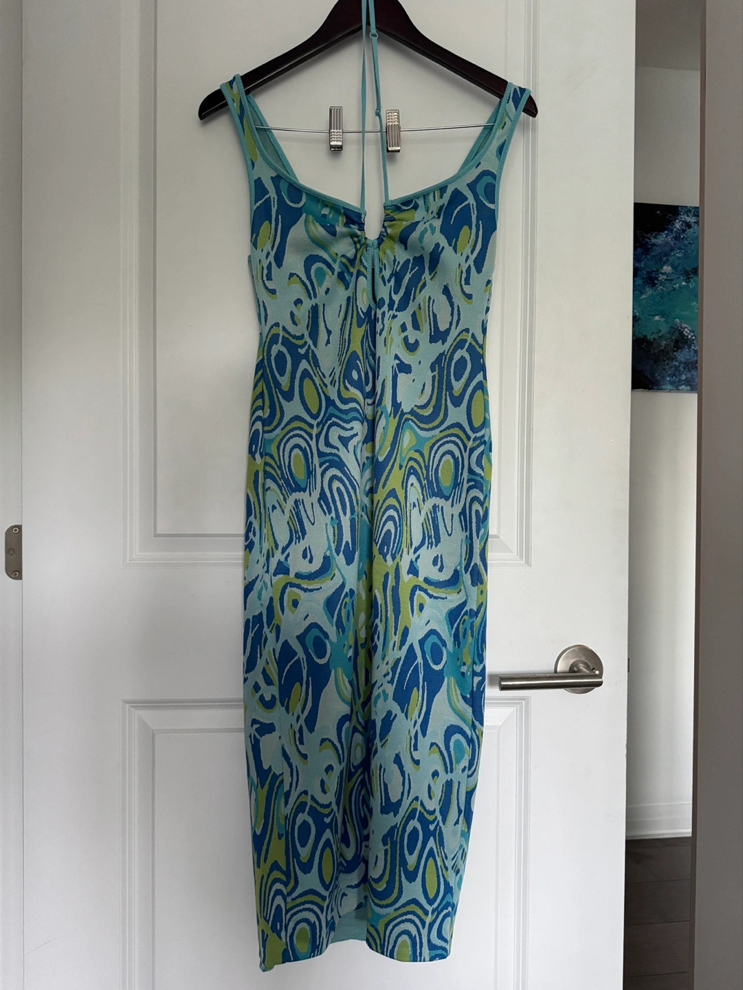 Clingy, sexy dress with a fun blue pattern. The dress includes a halter tie at the neckline that’s adjustable. Perfect for a patio date!