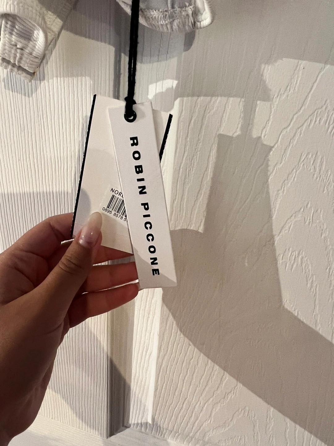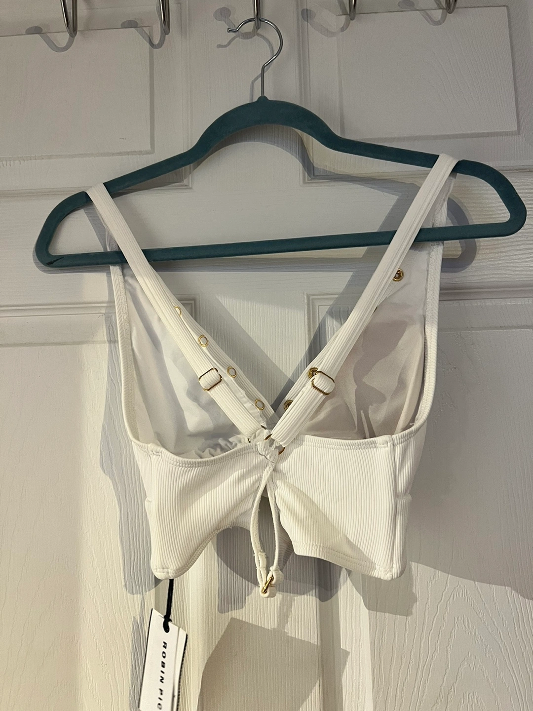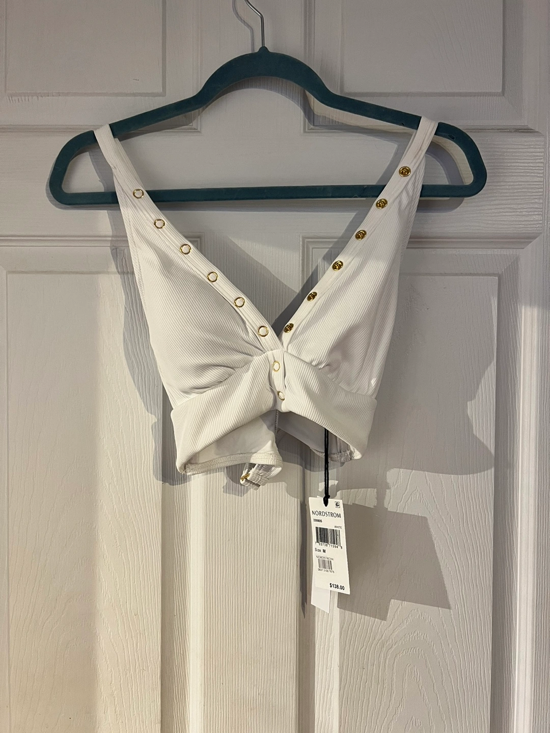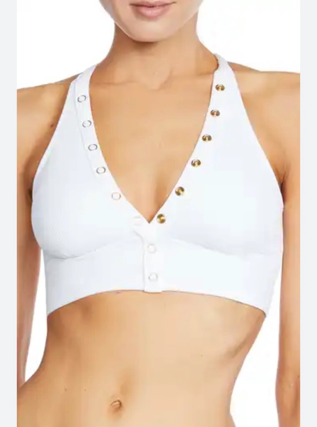 104Lovely white top. A ribbed material. Gold-toned hardware. A V-neckline. Perfect to wear on a warm day, so you can feel relaxed.