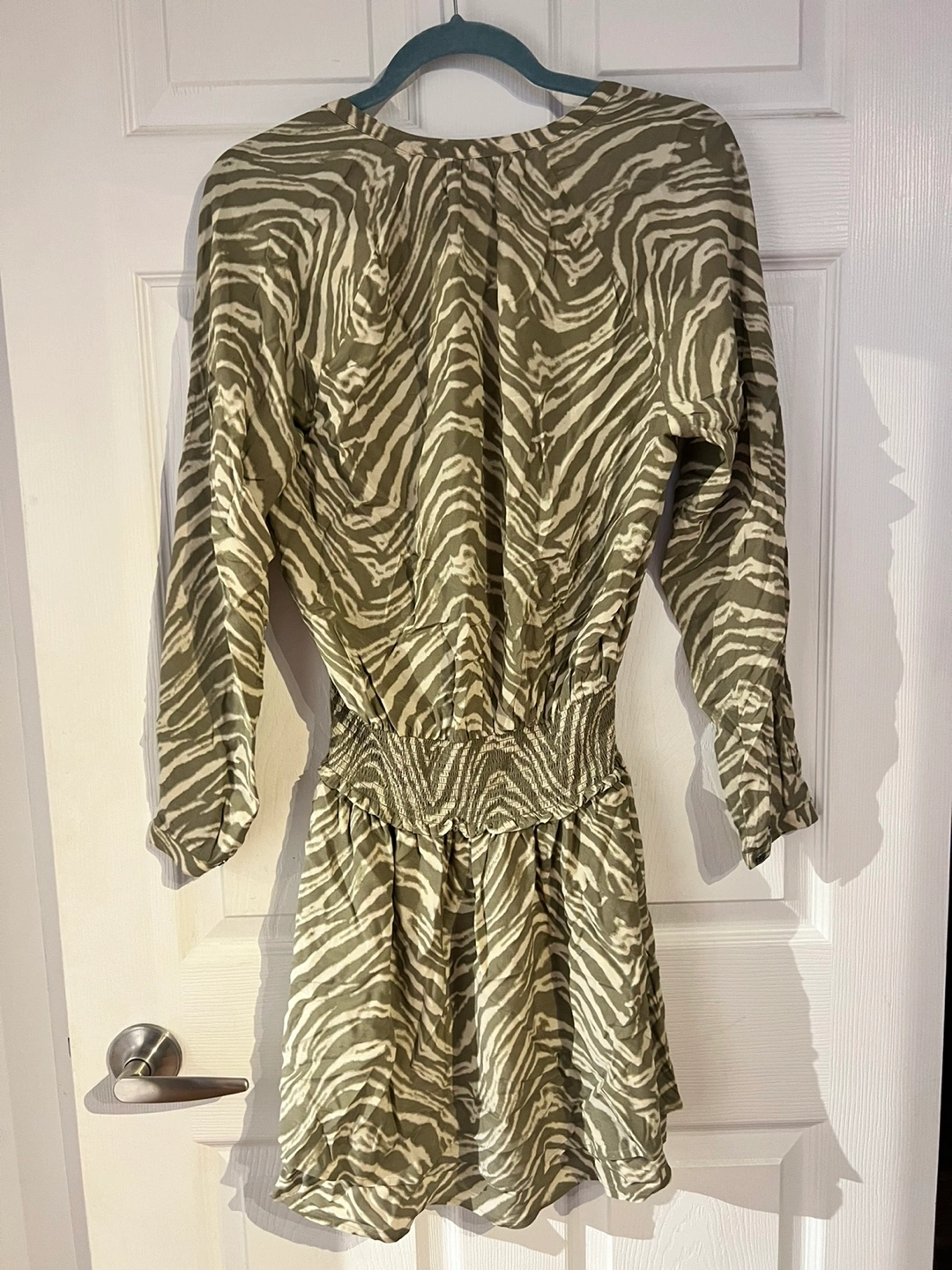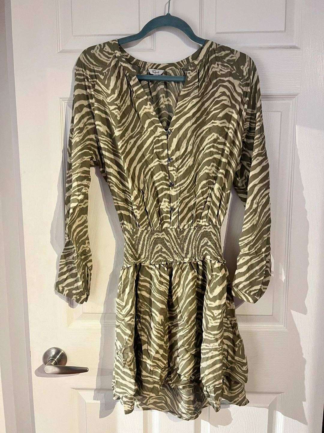 104The dress features long sleeves and an elastic waist. Designed with a collared neckline and button closure. It is patterned with a unique zebra print, which would be perfect for a lovely brunch outing.