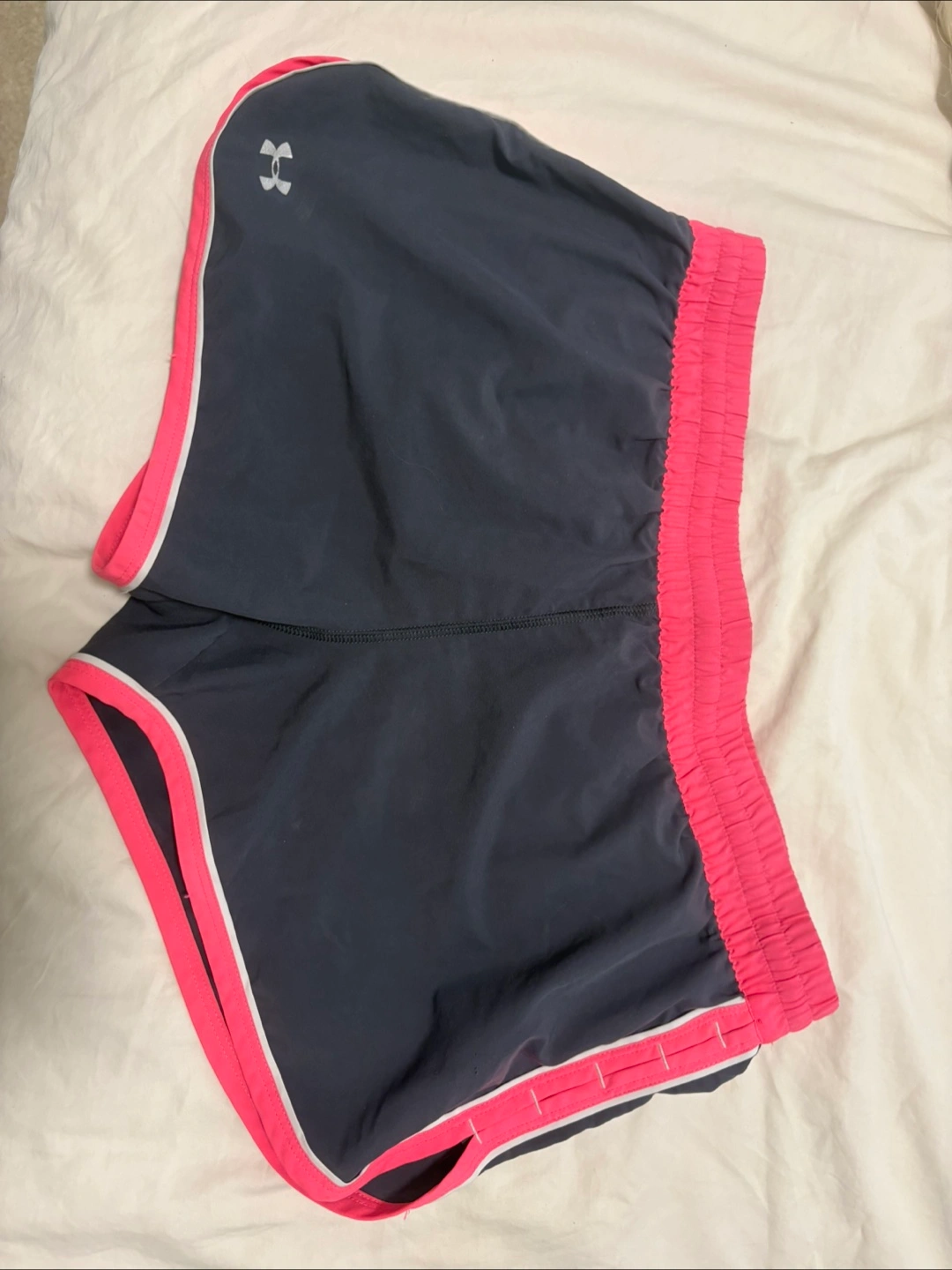 Dark grey shorts with pink and white trim. Elastic waistband and drawstring. Built-in brief lining. Part of under armour’s breast cancer awareness line, only worn a few times and been in my closet the rest. The grey is darker in person compared to photos.