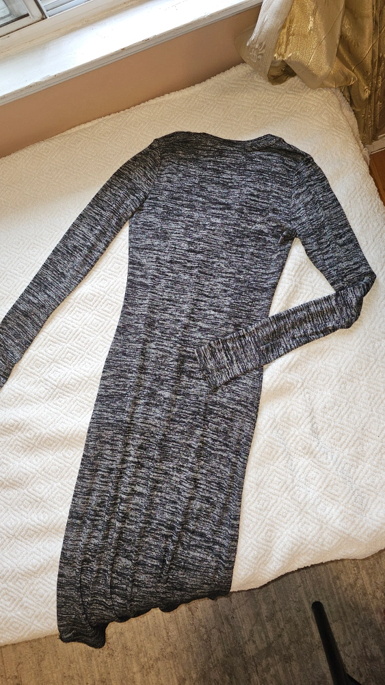 The dress is long with long sleeves. It has a V-neck. The pattern is a mix of black and white threads. A lovely piece that can be worn during any casual or semi formal occasion.