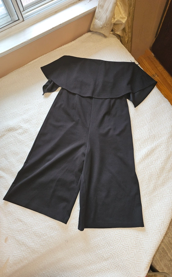 A beautiful black strapples culottes jumpsuit with large flowy ruffles all around the neckline. Features 3/4 length wide legs and a ruffled top. Perfect for a night out.
