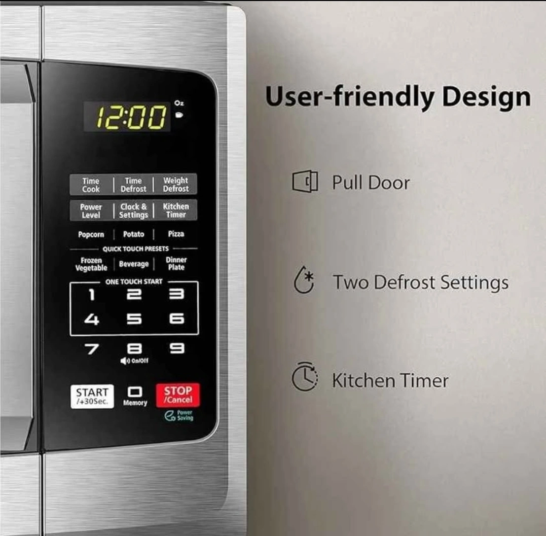 Special feature- Easy defrost, 6 preset menus, Oven capacity: 0.9 cu. ft., 900 watts with 10 power levels