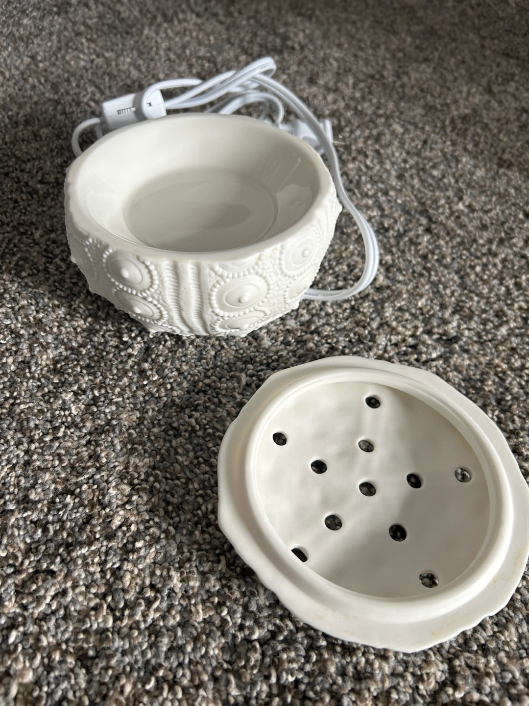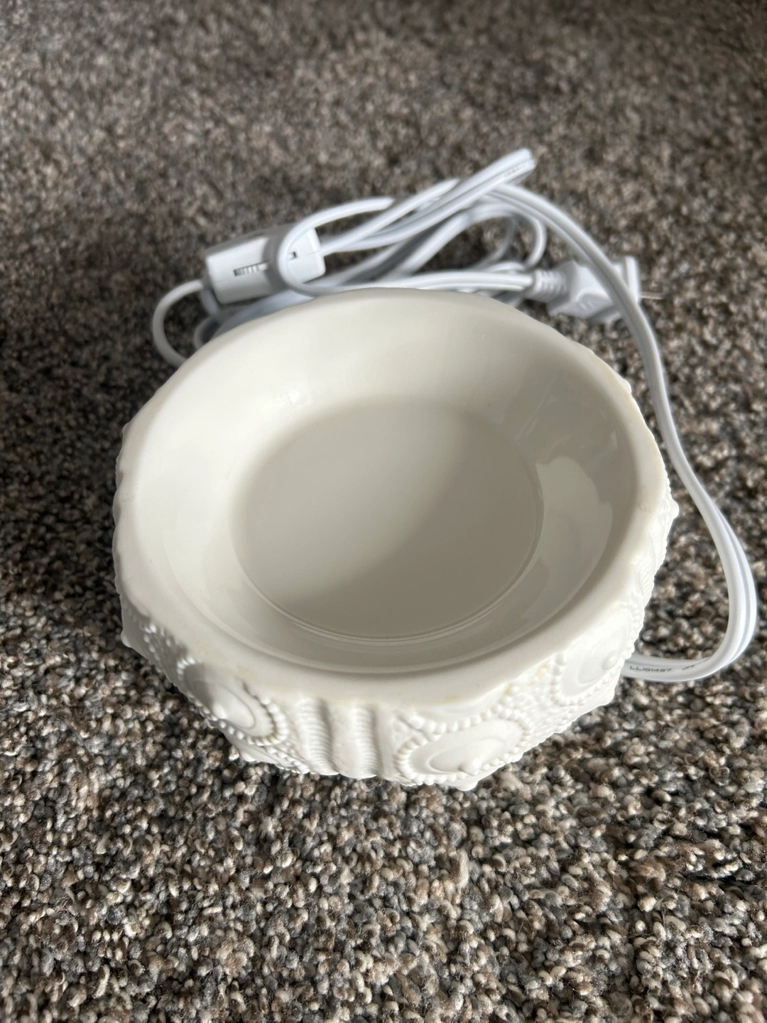 A beautiful ceramic wax warmer with a unique embossed design. It has a white power cord and a small bowl for wax. A perfect addition to any room for a relaxing ambiance.