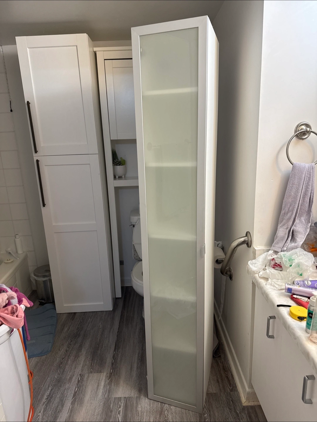Tall white cabinet. Multiple shelves for storage. Frosted glass door. Ideal for small bathrooms to keep your toiletries organised and readily available, helping you create a peaceful sanctuary. 180cm tall and 30cm wide
