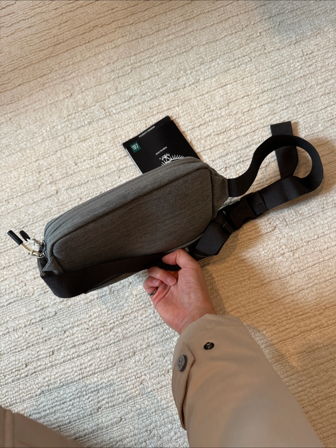 Crossbody bag in a neutral gray colour. The bag has a zipper closure. Adjustable strap. A great item to carry on walks to keep your hands free.