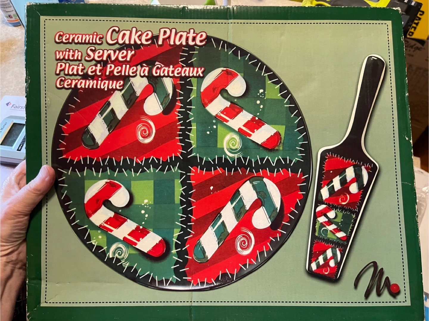 A delightful ceramic cake plate. Candy cane design with a matching server. A great way to serve treats to guests for the holidays.