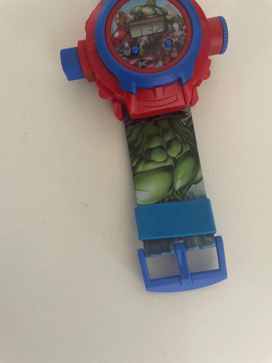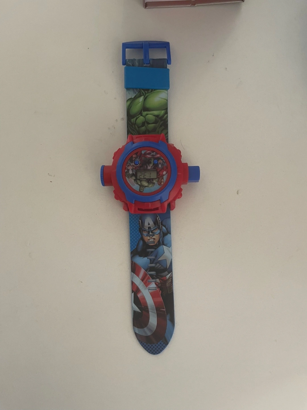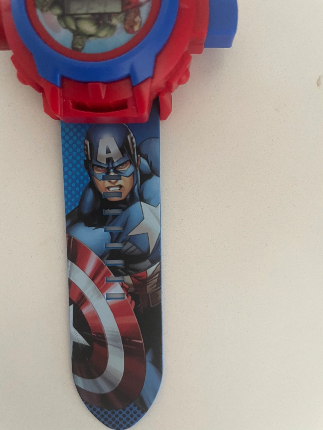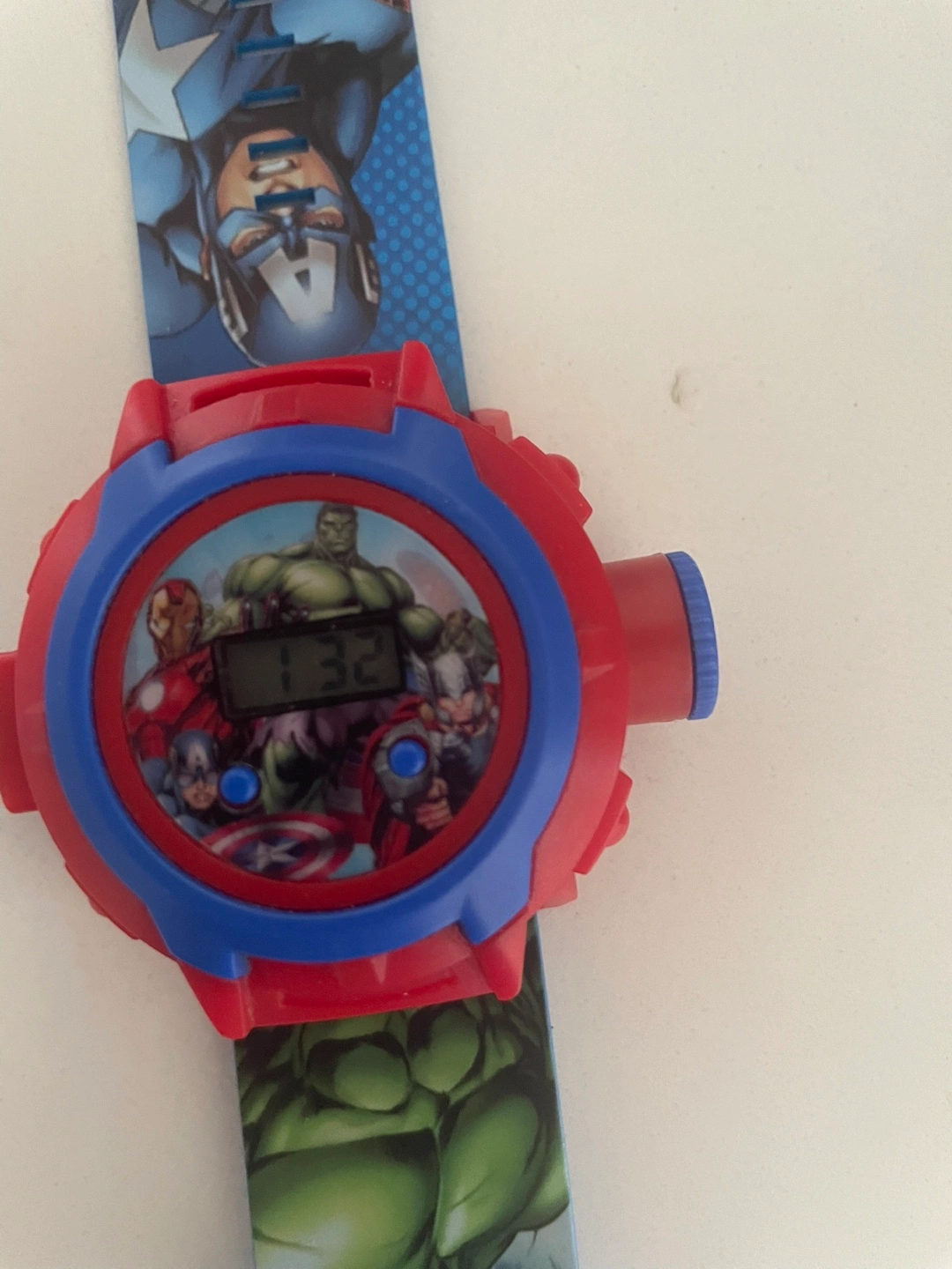 A fun Marvel Avengers-themed watch. Featuring images of Hulk, Captain America, and other heroes. It is a digital watch. Take a deep breath and you will be at ease knowing you're on time.