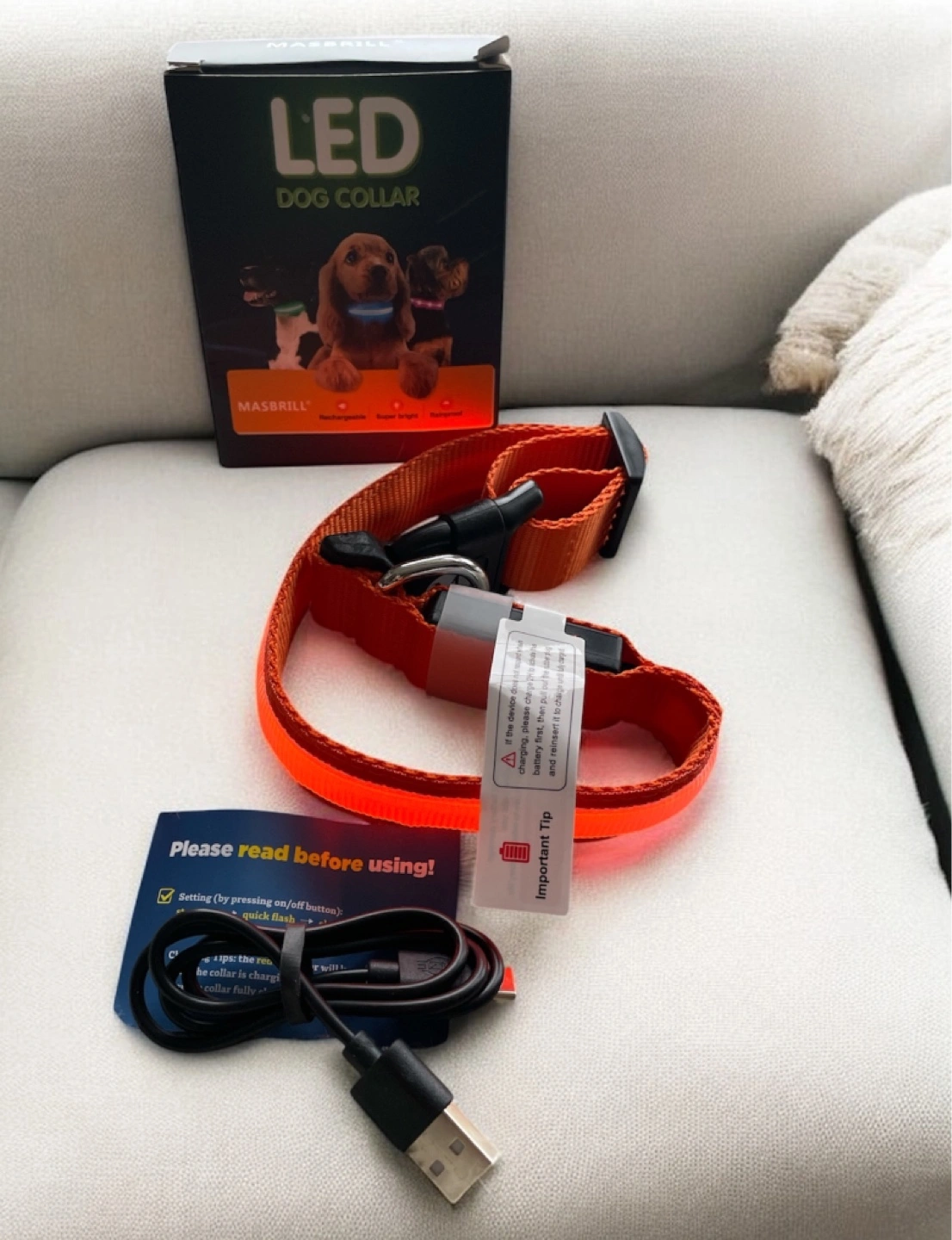New LED dog collar. Comes with an adjustable strap and a buckle. Makes for a great way to keep an eye on your furry friend during nighttime walks. Size medium, adjustable from 15”-20”. Rechargeable and includes cable. Item as shown. New in box. Colour is orange. https://a.co/d/3mx4Mt8