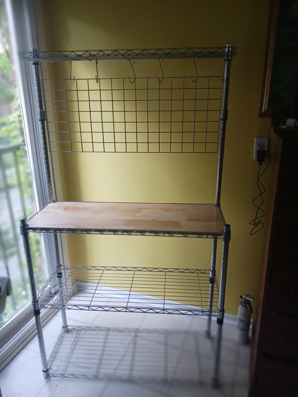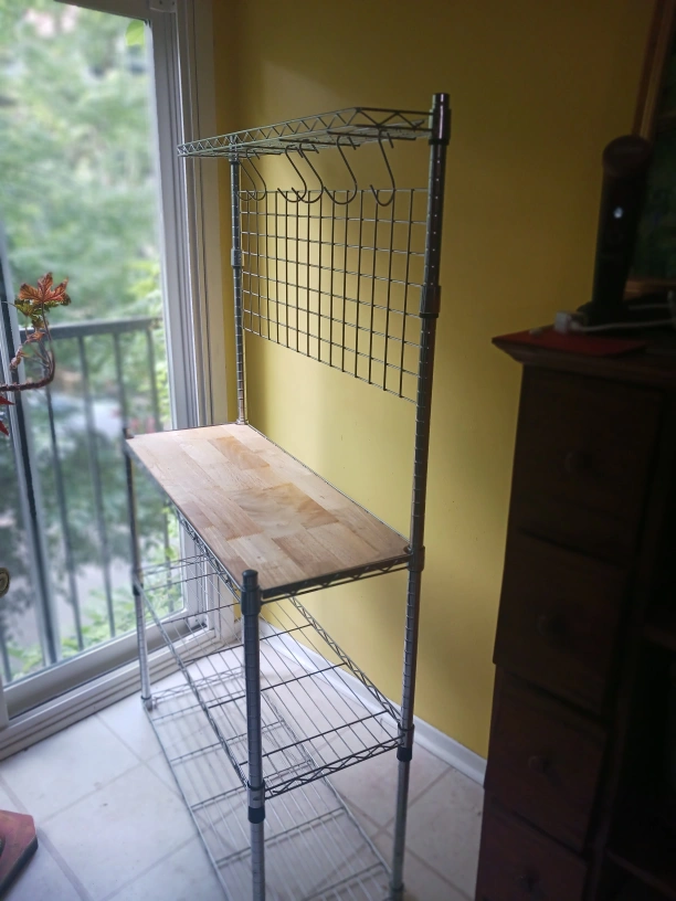 Metallic rack. Wire shelves and a butcher block-style countertop. Features hooks and a wire grid. A great spot to organize and enjoy your space after a long day.
