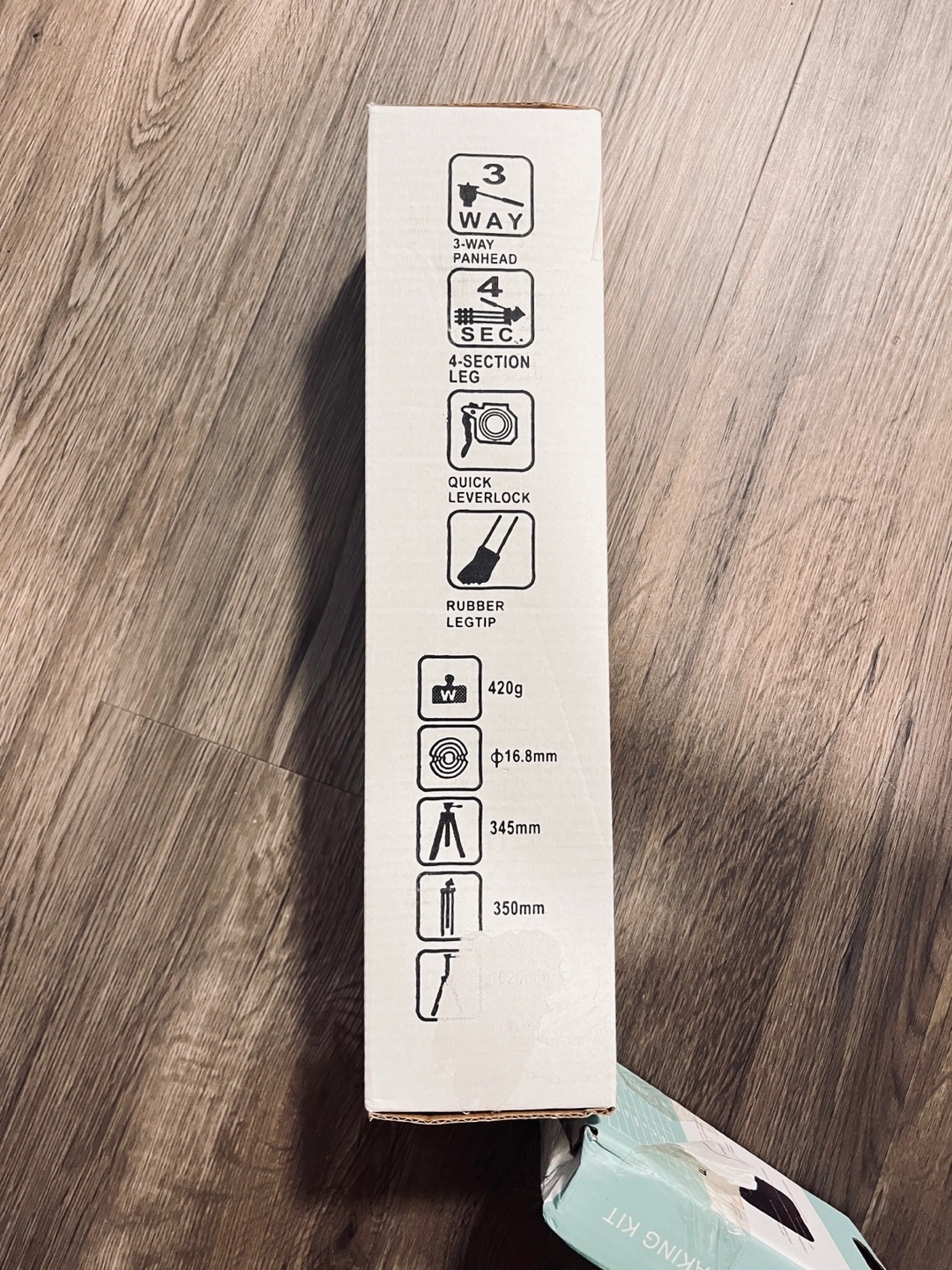 I am selling a tripod and LED video light kit. Features include a 3-way panhead, 4-section leg, and quick lever lock.