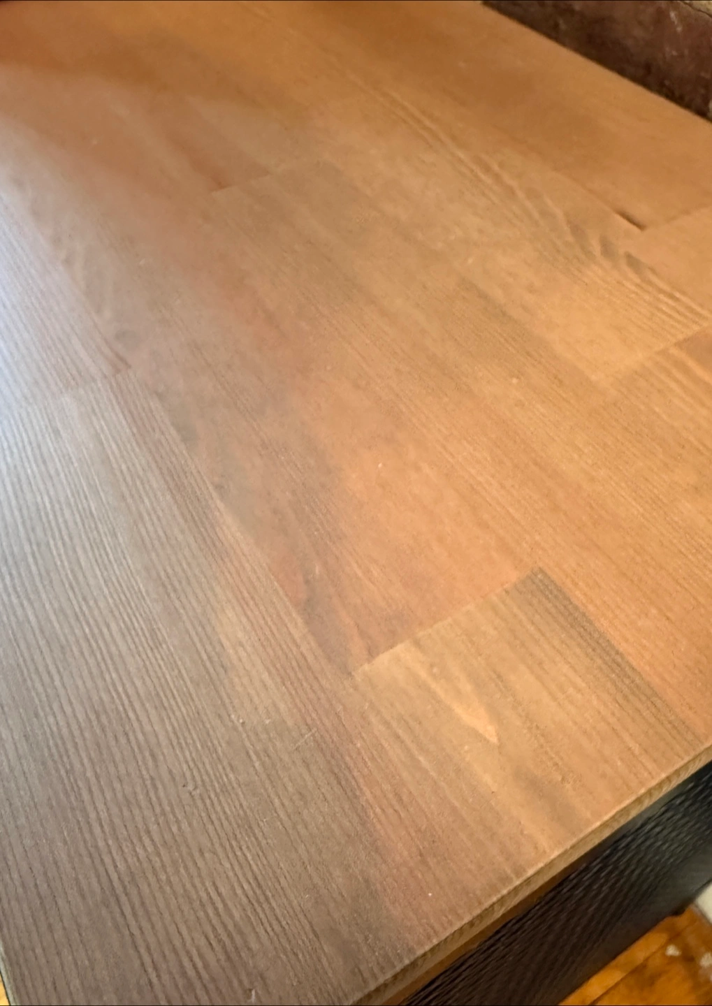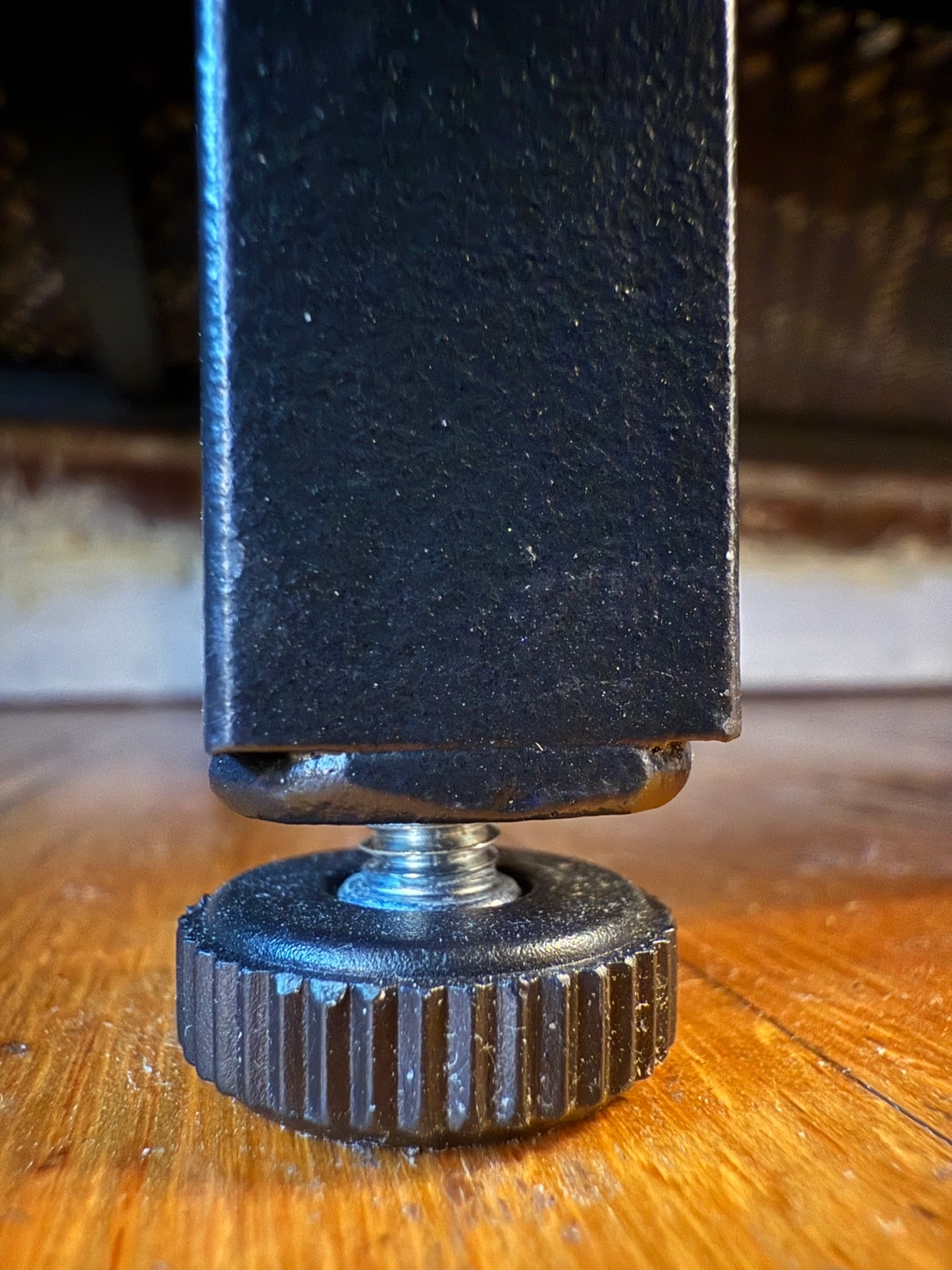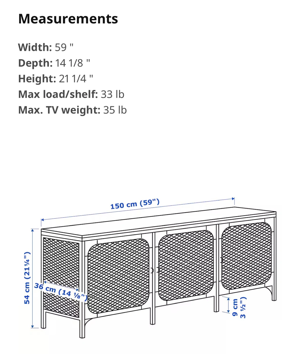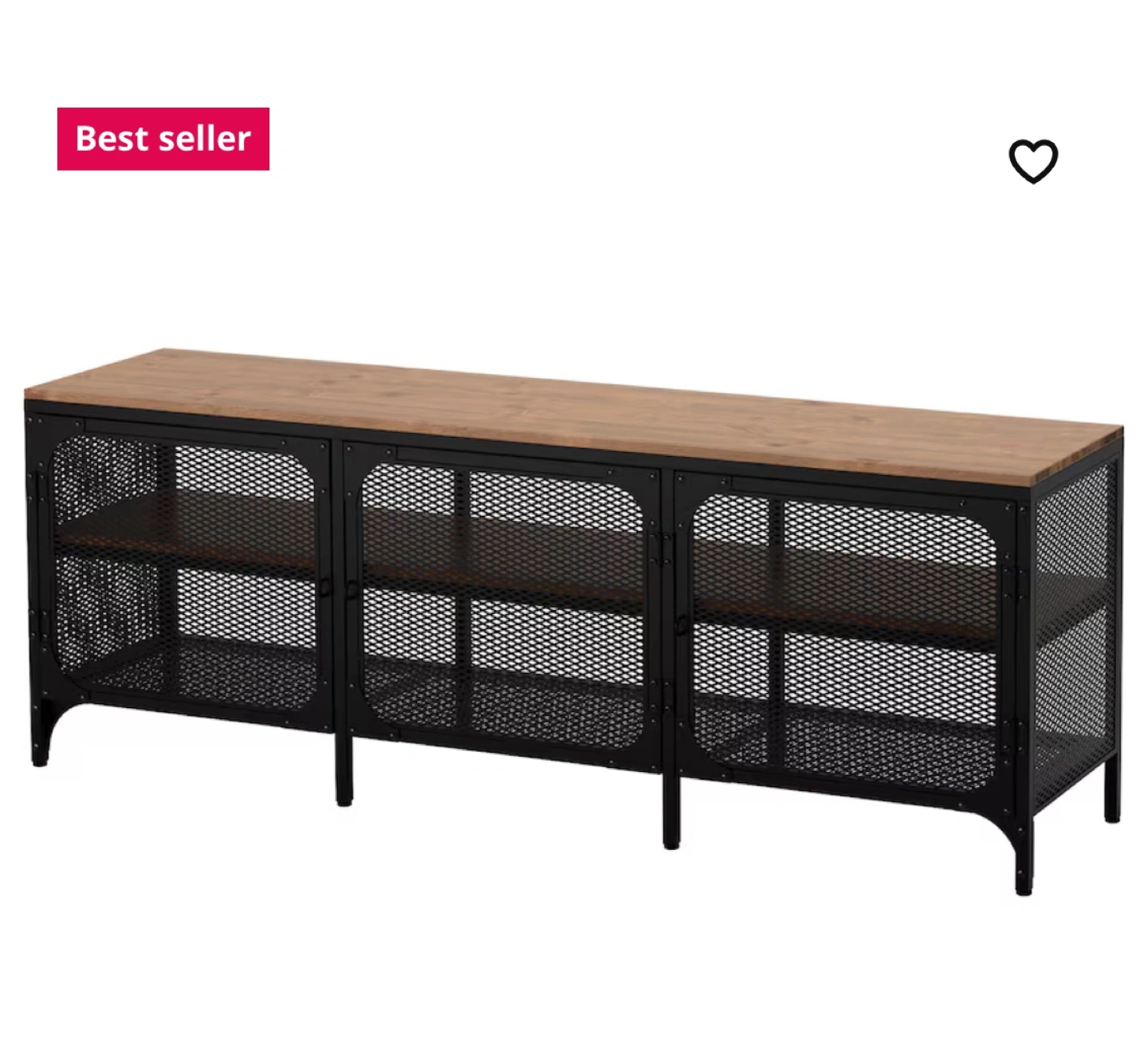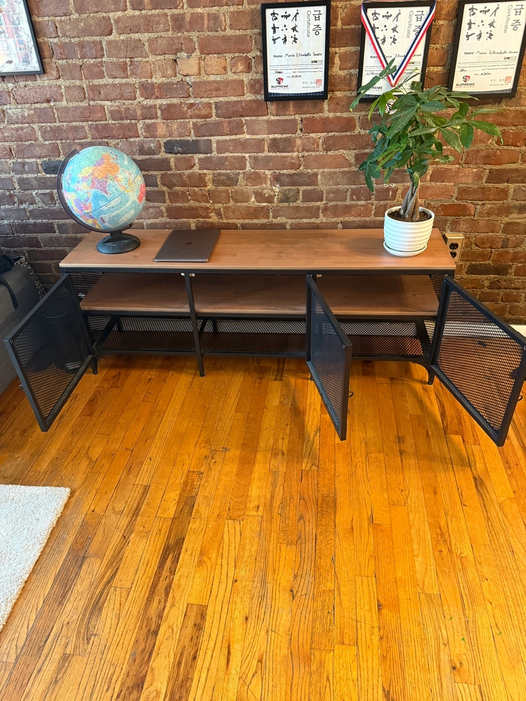 Entertainment center, featuring a light brown wooden top. Adjustable feet, It has a black metal frame with mesh doors. This could be an ideal addition to your home, where you can calmly enjoy your favorite shows and movies.