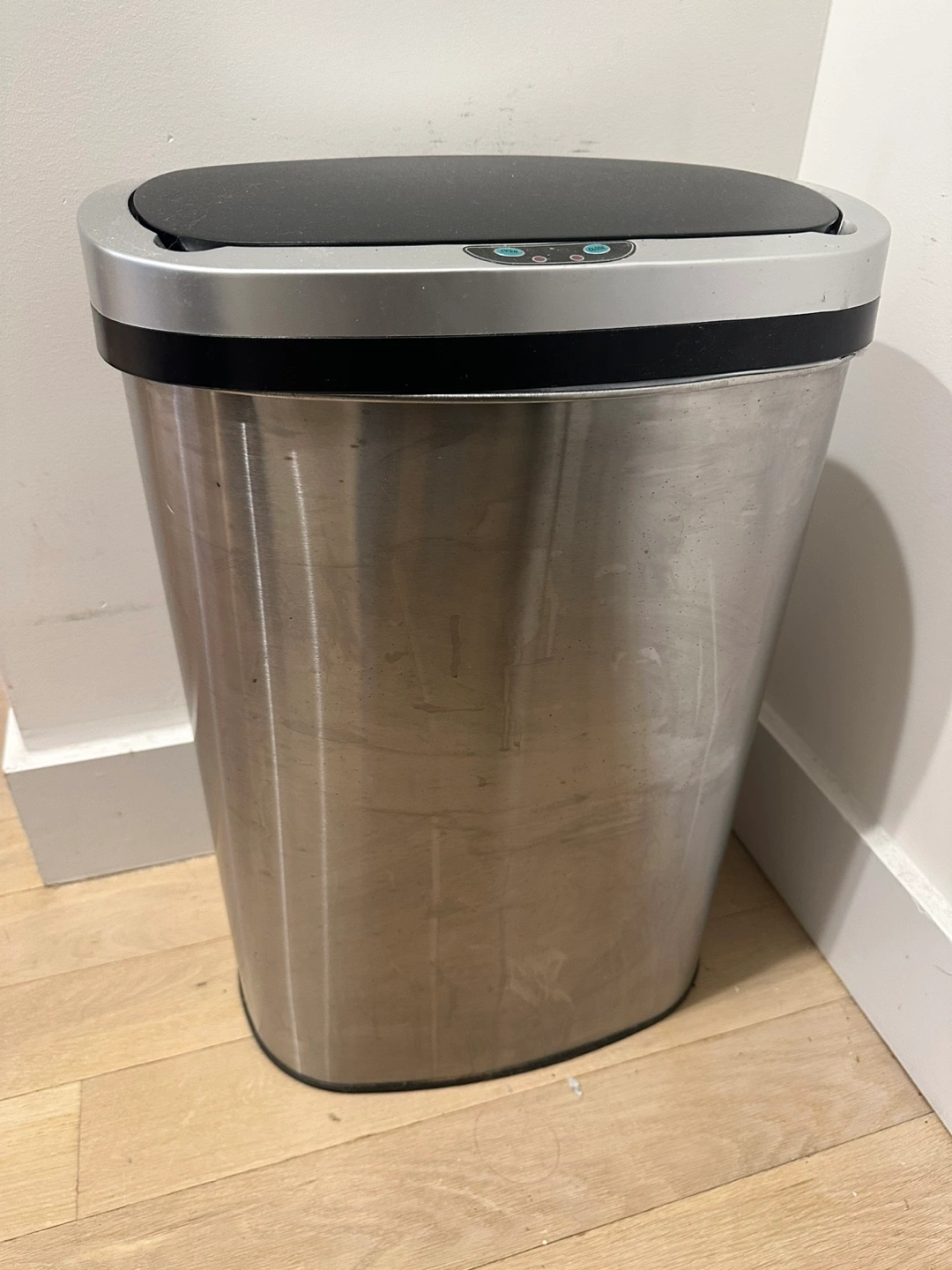 Made of stainless steel. Features a touch-free sensor. The lid is black. Great for any room in the house to keep things clean and sanitary.