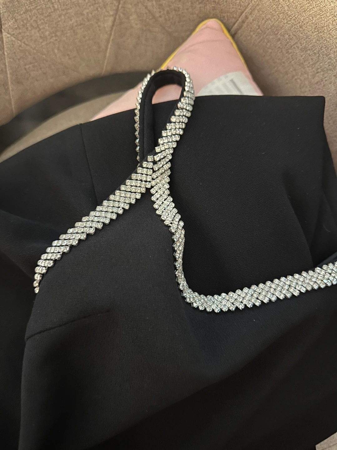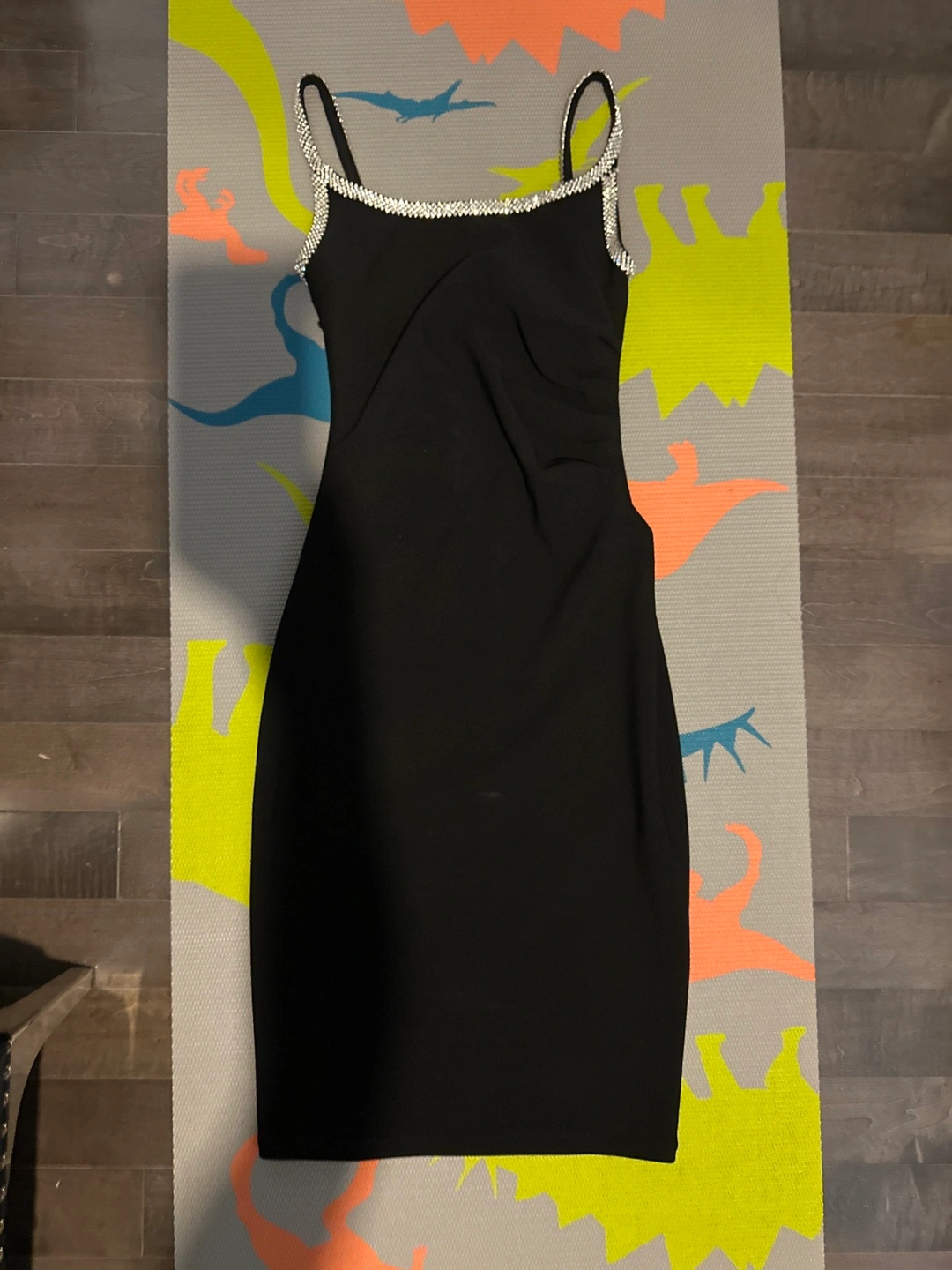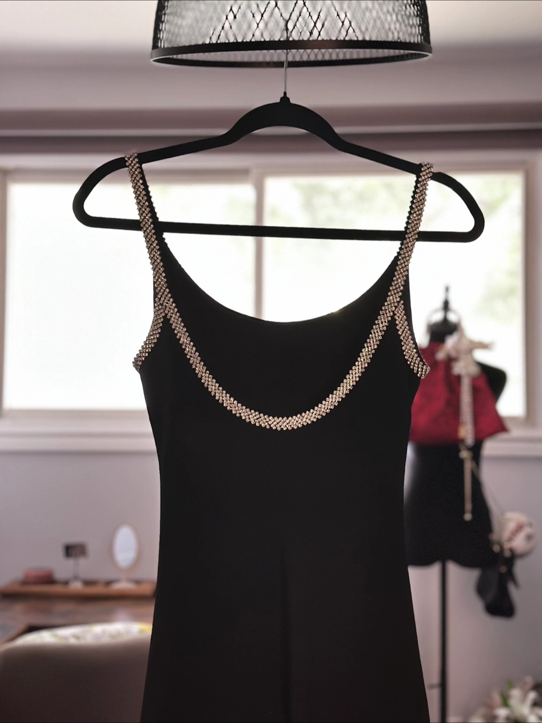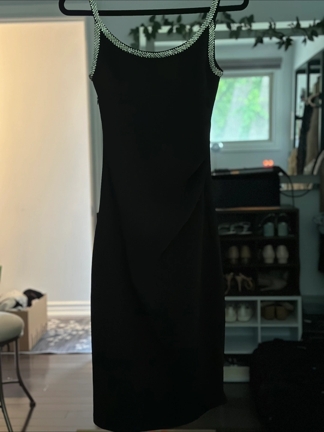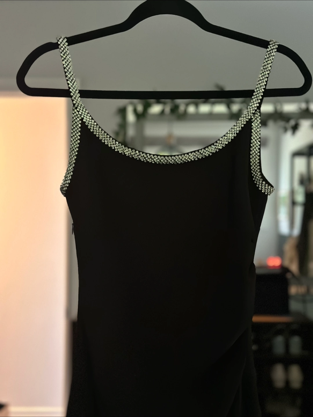 A sleek black dress, perfect for those special occasions. Featuring rhinestone trim along the straps and neckline, this dress is sure to make you feel confident and radiant. Perfect for a night out and a few relaxing drinks, to clear your mind.
