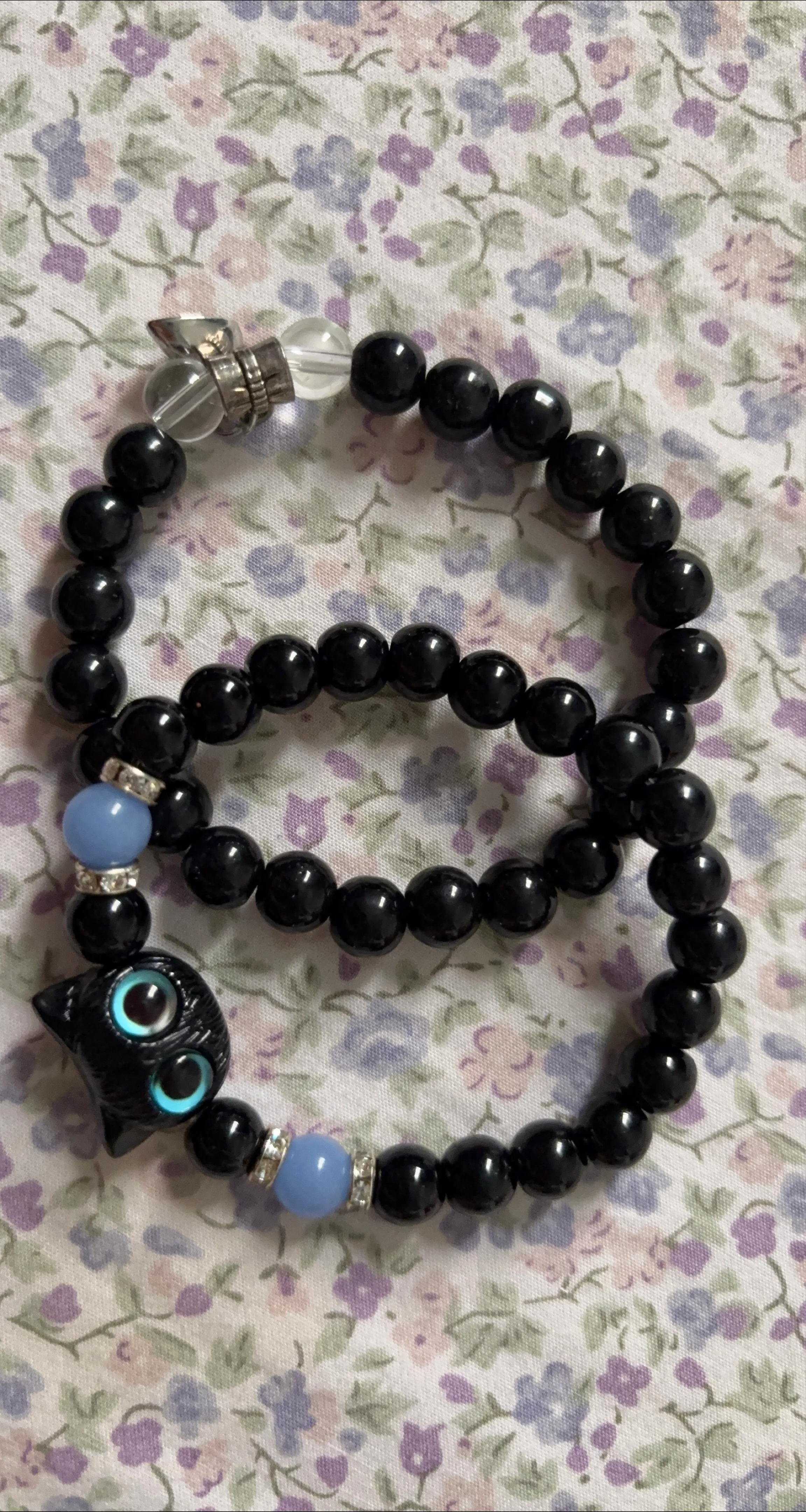 A beautiful bracelet featuring black beads. Includes a cat charm, and a few other beads. A perfect accessory to add a touch of elegance to any outfit, or to use as a calming aid when feeling anxious.