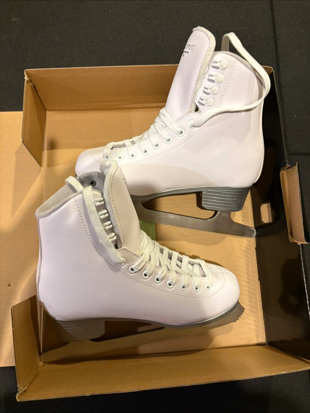 Fresh pair of ice skates. Come with a factory sharpened stainless steel blade. A peaceful activity to enjoy on the ice, gliding and skating.