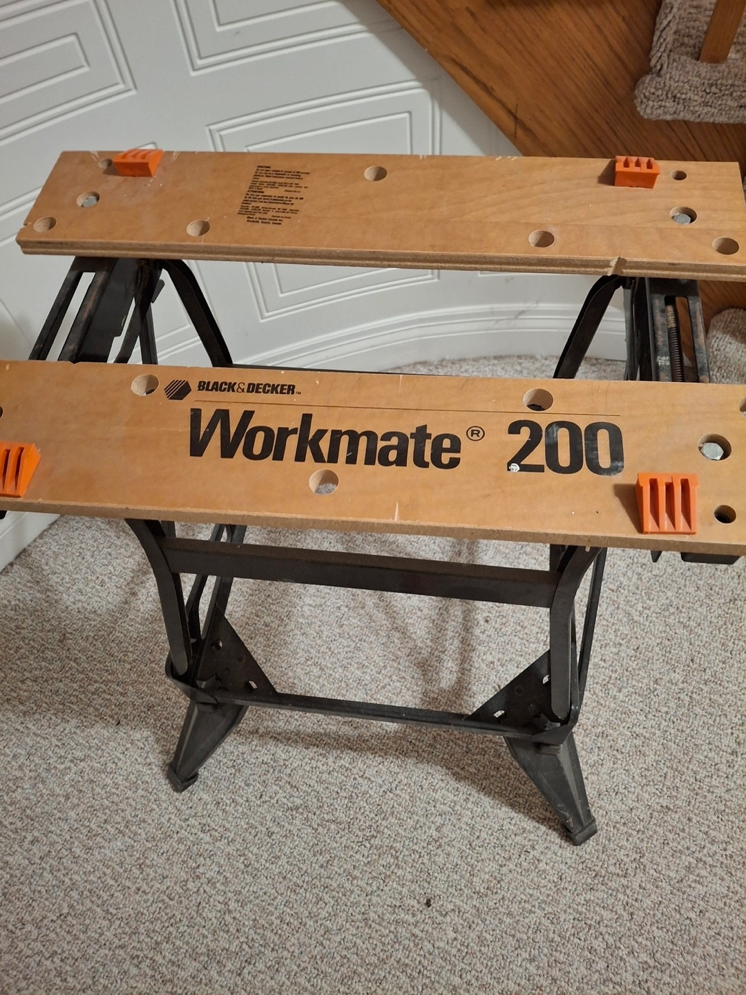 Black+Decker workbench, “Workmate 200” model. Portable & foldable, easy to store or transport. Adjustable height (25” or 34”), holds up to 300lbs. Minor wood split in one area shown in last photo. Regularly $100+ in stores. Available for pickup in Markland Wood.